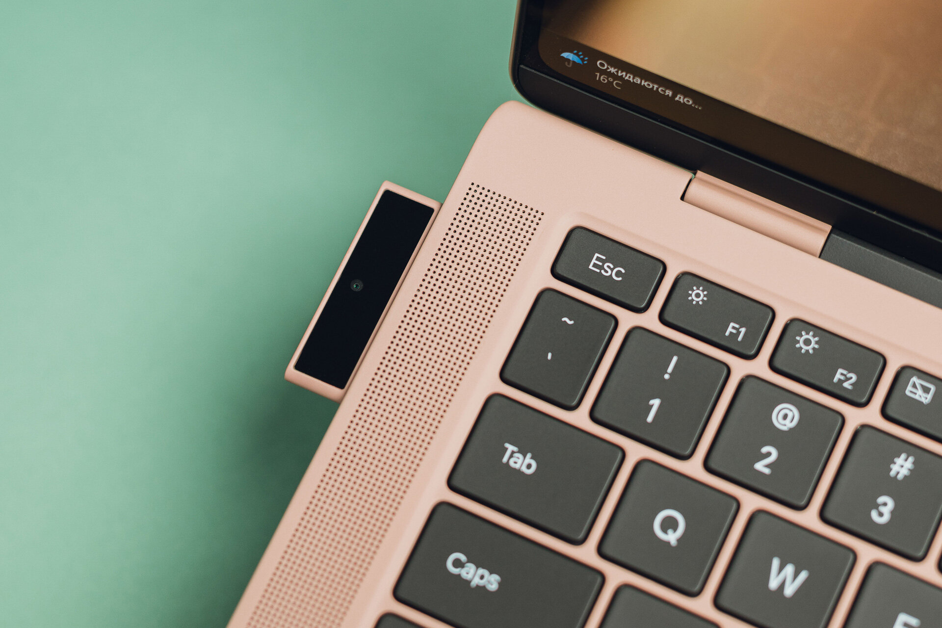 А всё потому, что фактически «фронталки» в классическом представлении здесь и нет, зато есть выдвигаемый магнитный модуль камеры, который находится в корпусе и достаётся при необходимости, чтобы закрепиться на крышке. Как по мне, это исключительно отличное решение, которое и рамку над экраном уменьшает (дисплей занимает 97% панели), и максимальную конфиденциальность обеспечивает.