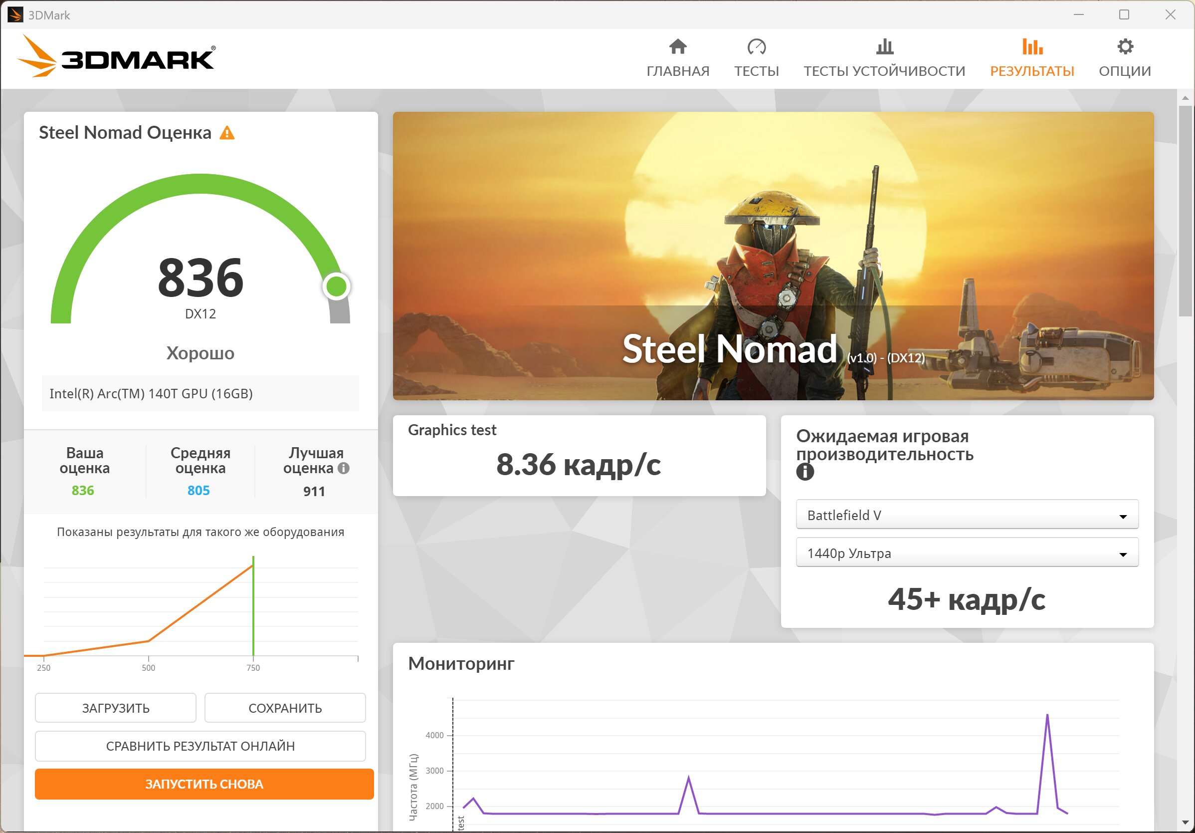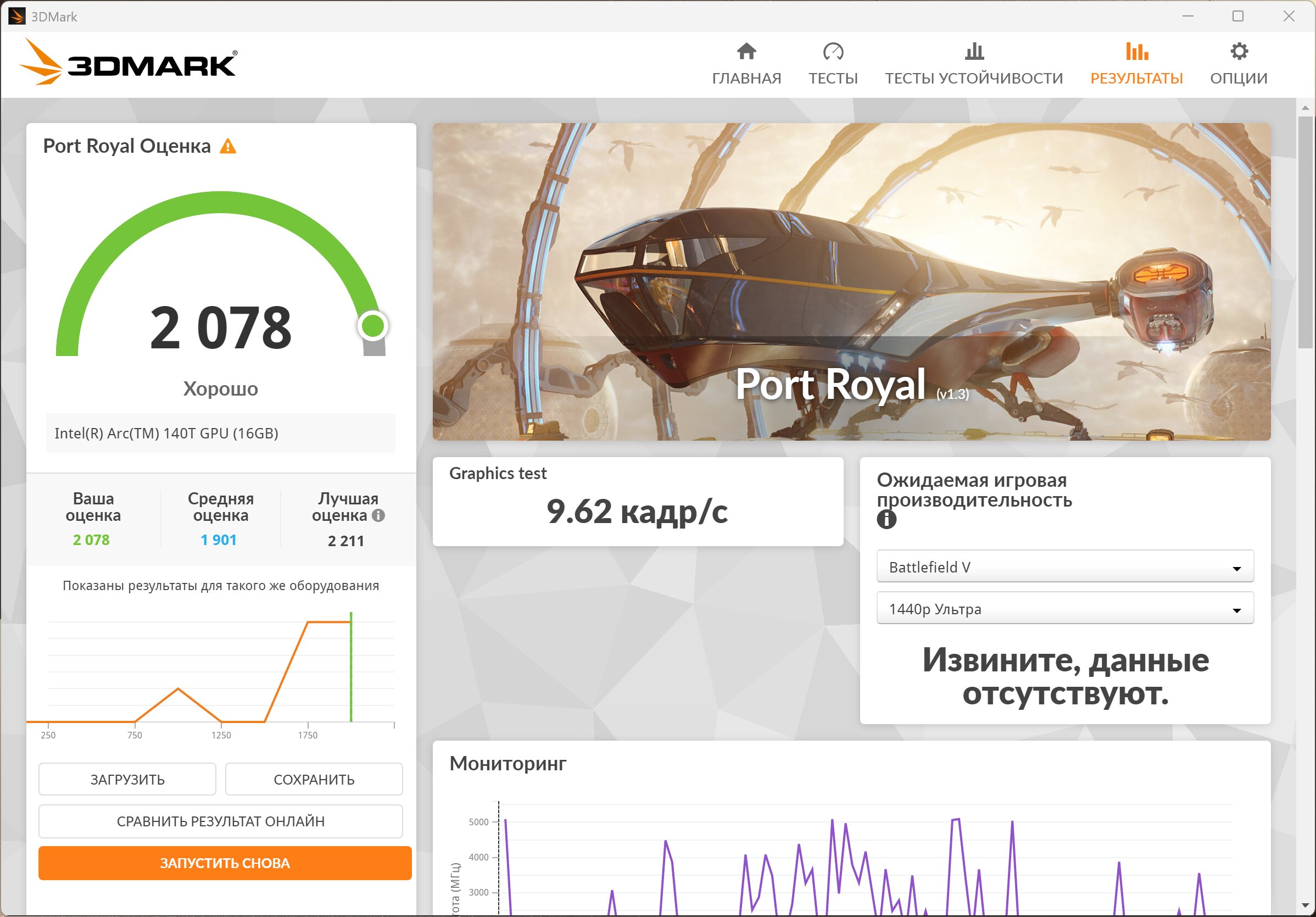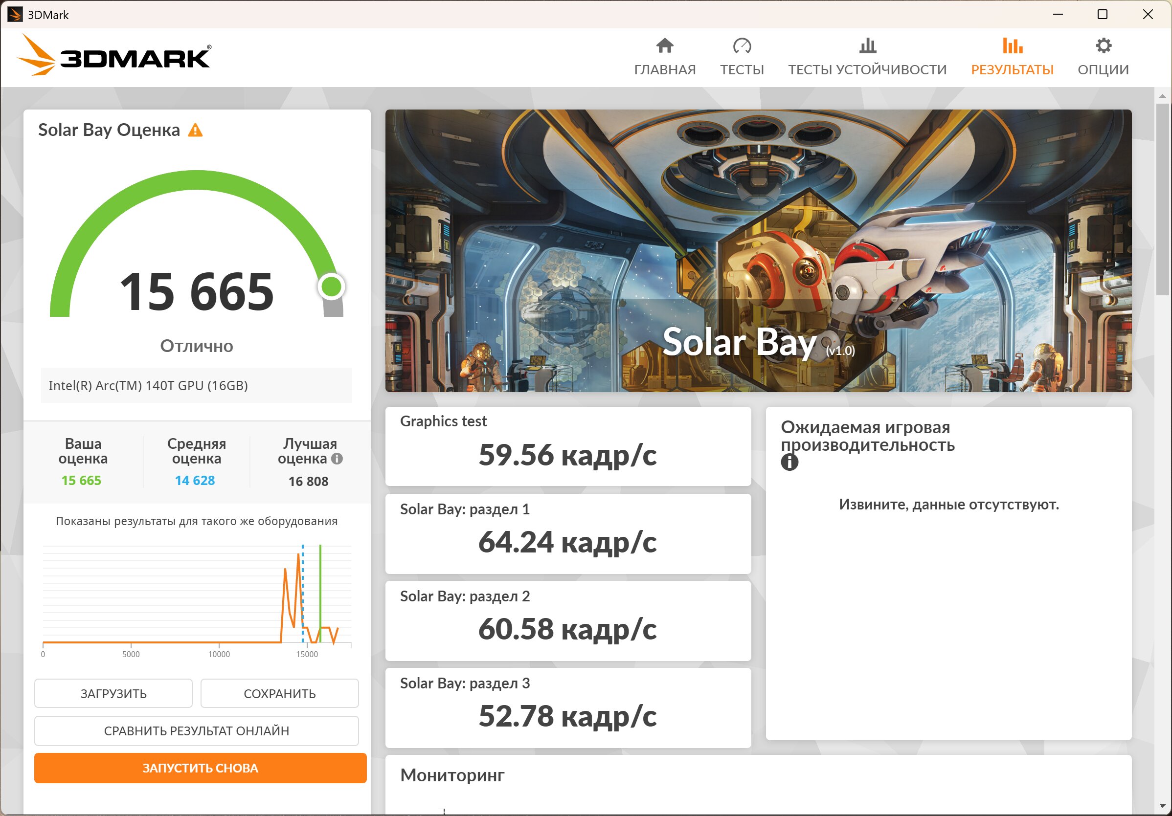 А вот встроенная графика Intel Arc 140T — это явный компромисс компактного корпуса ультрабука. В отличие от процессора, который крепко держится в довольно тяжёлых программах, интегрированная видеокарта не справляется с сопоставимой нагрузкой ни в ресурсоёмких приложениях, ни в современных играх. В конкурентных гаджетах за такую цену графика встречается получше, но речь о тяжёлых ноутбуках, а не о лёгком и тонком ультрабуке.