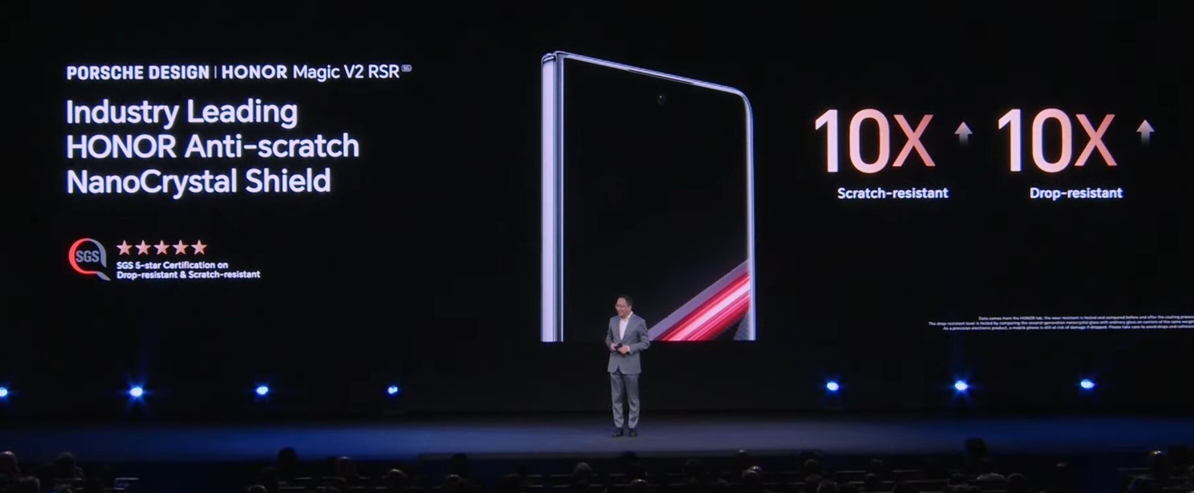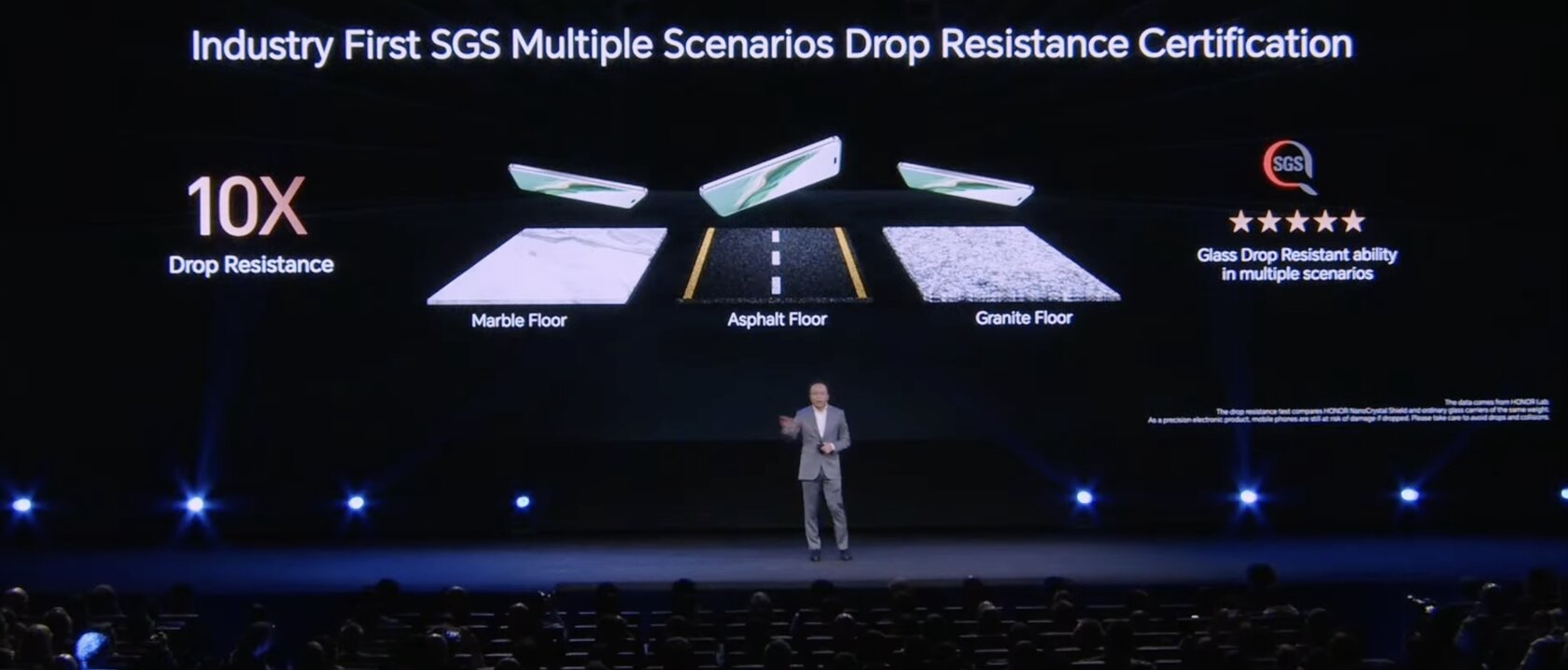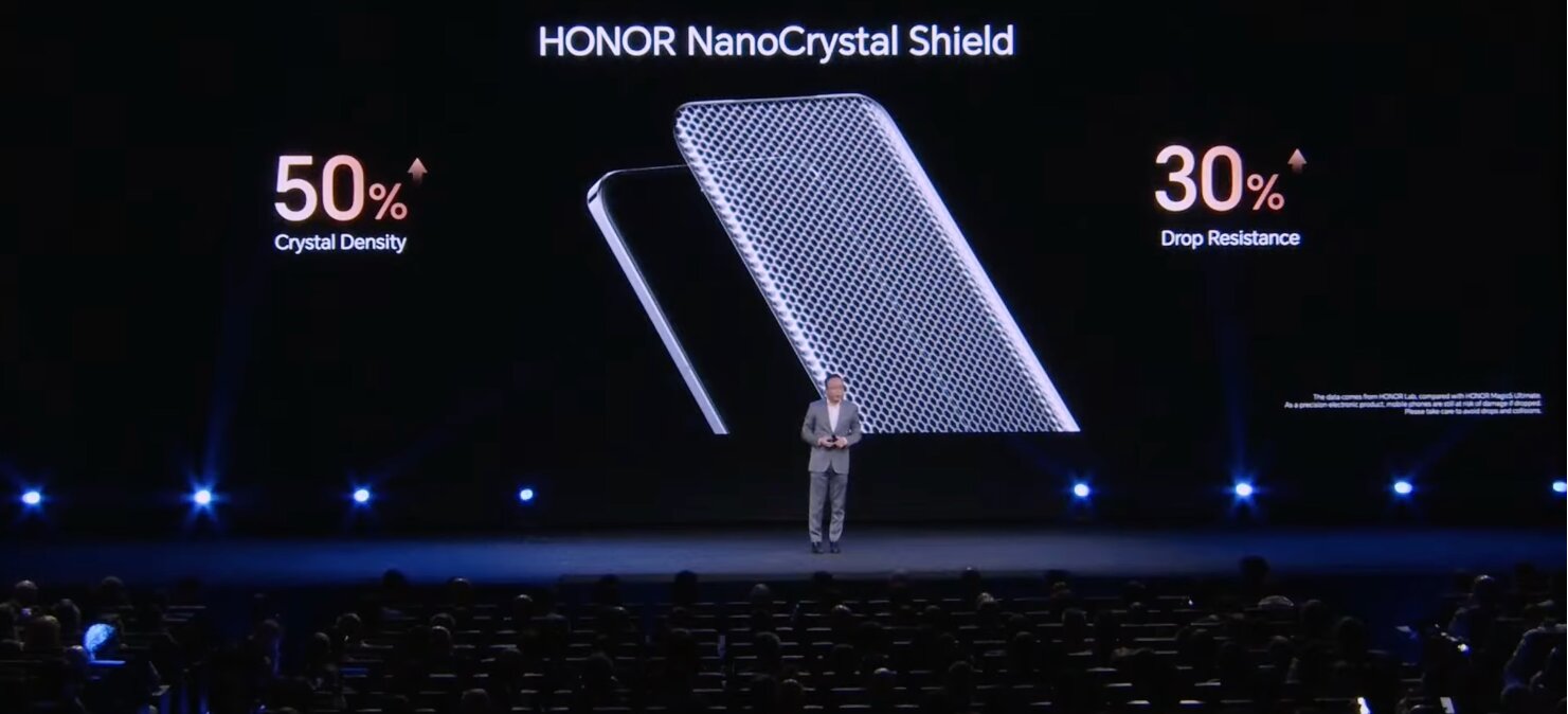 Этот смартфон тоже получил защитное стекло NanoCrystal Shield, которое не боится большинства видов физического воздействия — у него прочность в 7 баллов по шкале Мооса. Дабы продемонстрировать это, СЕО компании HONOR прямо на сцене весьма активно тёр ключами от автомобиля по дисплею этого гаджета, а потом на камеру показал, что ни одной царапины на стекле не осталось. Кроме того, ранее в своём офисе в Шэньчжэне сотрудник компании натирал стекло наждачной бумагой — тоже без заметных повреждений. Это отличная новость для тех, кто переживает о прочности и надёжности складных смартфонов.