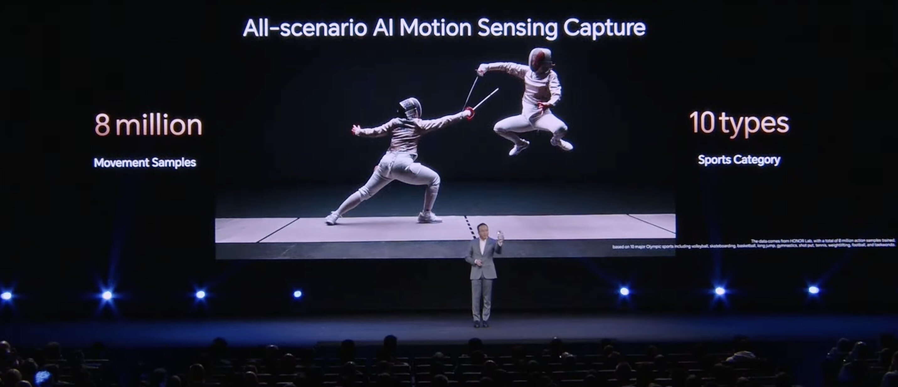 Ещё у флагмана имеется действительно продвинутая система камер — с основным датчиком на 50 Мп, сверхширокоугольной камерой на 50 Мп и телеобъективом на 180 Мп. Смартфон отлично снимает как днём, так и ночью, а фронтальная камера (тоже на 50 Мп) заслужила наивысшую оценку от DxOMark (вероятно, основная система камер тоже попадёт в топ, но на текущий момент платформа ещё не выставила оценку). Отдельное внимание на презентации уделили камере HONOR Falcon, а также алгоритму съёмки на базе искусственного интеллекта HONOR Falcon Capture, который использует базу обучения ИИ с увеличенным в 28 раз дата-сетом. Благодаря этому апгрейду система научилась автоматически захватывать движения в кадре даже без нажатия на кнопку спуска затвора ещё в большем количестве сценариев, создавая чёткие снимки даже в очень насыщенных действиями сценах (например, в ходе поединка по фехтованию).
