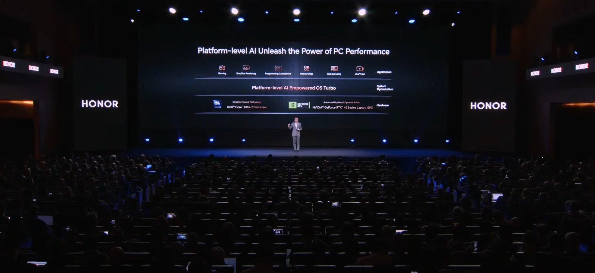 За производительность устройства отвечает процессор Intel Core Ultra 7 (вероятно, модель 155H с 16 ядрами, TDP в 65 Вт и весьма неплохими показателями в бенчмарках), а графическим ускорителем выступает мобильная дискретная графика NVIDIA GeForce RTX 40 (встроенная графика у процессора тоже имеется — Intel ARC). Для достаточно тонкого ноутбука, который выступает скорее рабочей станцией, чем игровым решением, характеристики более чем приличные. Впрочем, как и в случае со смартфонами, HONOR делает акцент на дополнительных фишках, позволяющих сместить производительность на второй план.