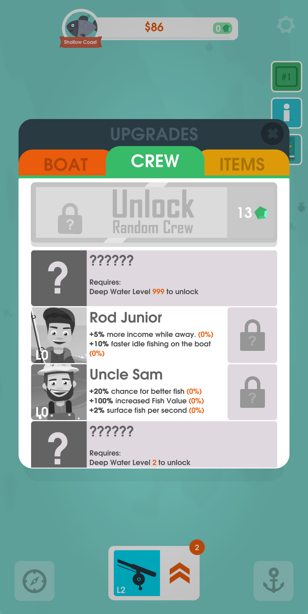 В этом приложении вы сможете отправиться в бескрайние земли для ловли редчайших видов рыб. Для этого нужно просто вовремя нажимать на экран! Пойманную рыбу можно продавать за немалую сумму, а на полученные деньги нанять новых членов команды для улучшения результата.