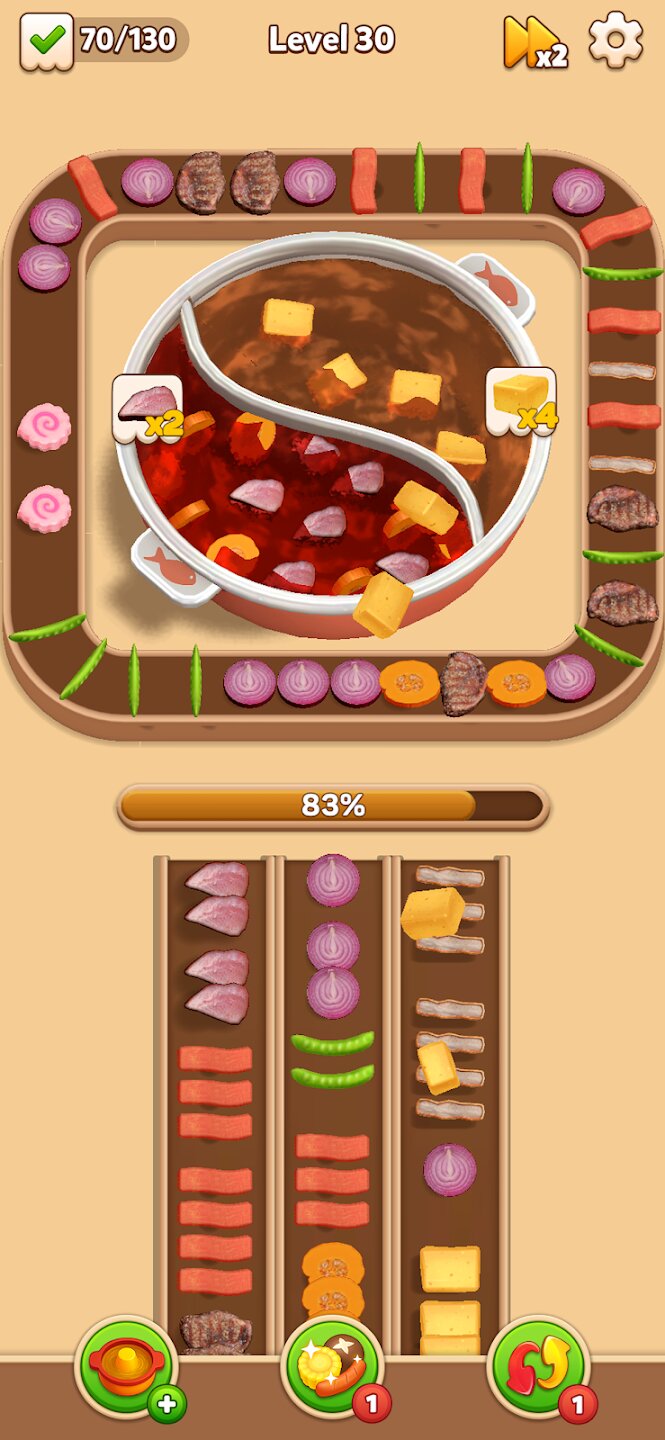 Основной игровой процесс основан на быстром мышлении и многозадачности. Ингредиенты скользят по конвейерной ленте, и вы должны стратегически сортировать их, чтобы сопоставить с заказами, отображаемыми над каждым горшком. Один неверный шаг или перегруженная лента могут привести к хаосу на кухне. По мере прохождения игры темп ускоряется, появляются более сложные комбинации ингредиентов и шаблоны, которые проверяют вашу скорость реакции и организаторские навыки. Каждое успешное сопоставление приносит удовлетворительное чувство потока и достижения.