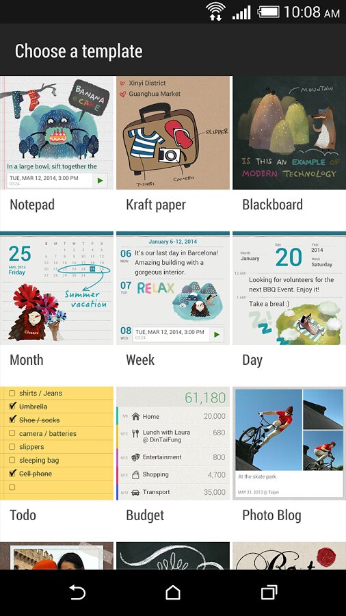 Scribble — со вы легко сможете развить художественные навыки и создавать заметки, содержащие фотографии, текст и иллюстрации с помощью шаблонов. Вашу заметку можно оживить, если включить в нее анимированный GIF-файл или добавить «живые» фотографии HTC Zoe.