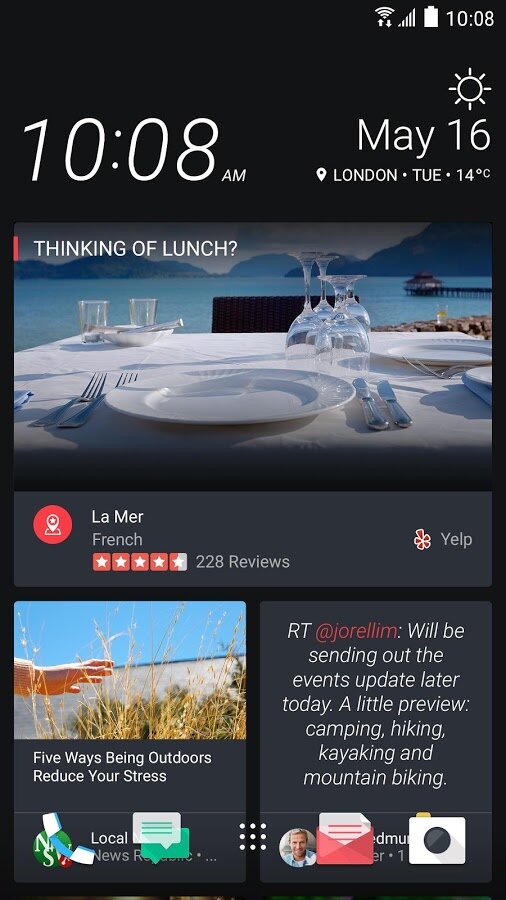 HTC Sense Home — объединяет возможности приложений BlinkFeed и HTC "«Темы»" для создания полностью настраиваемого и очень личного восприятия.
