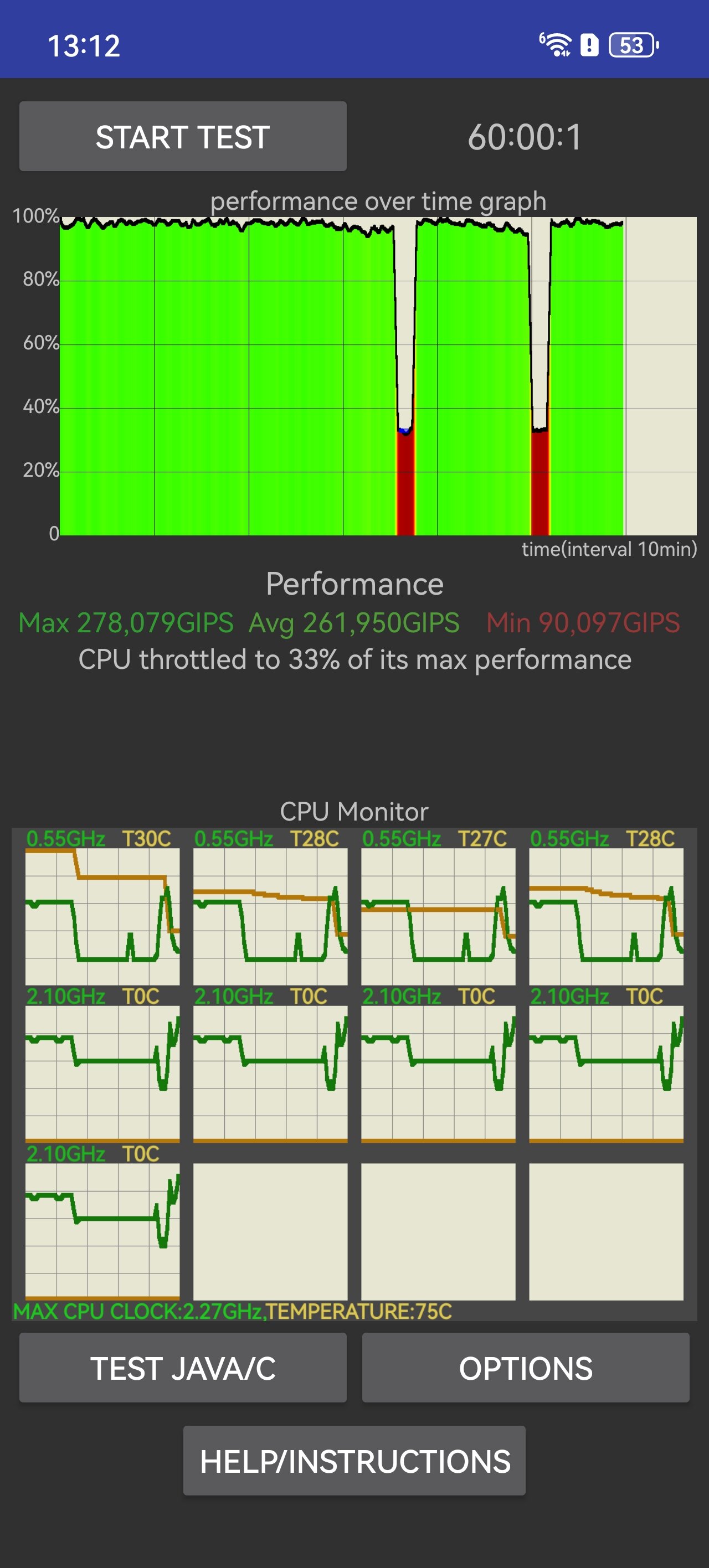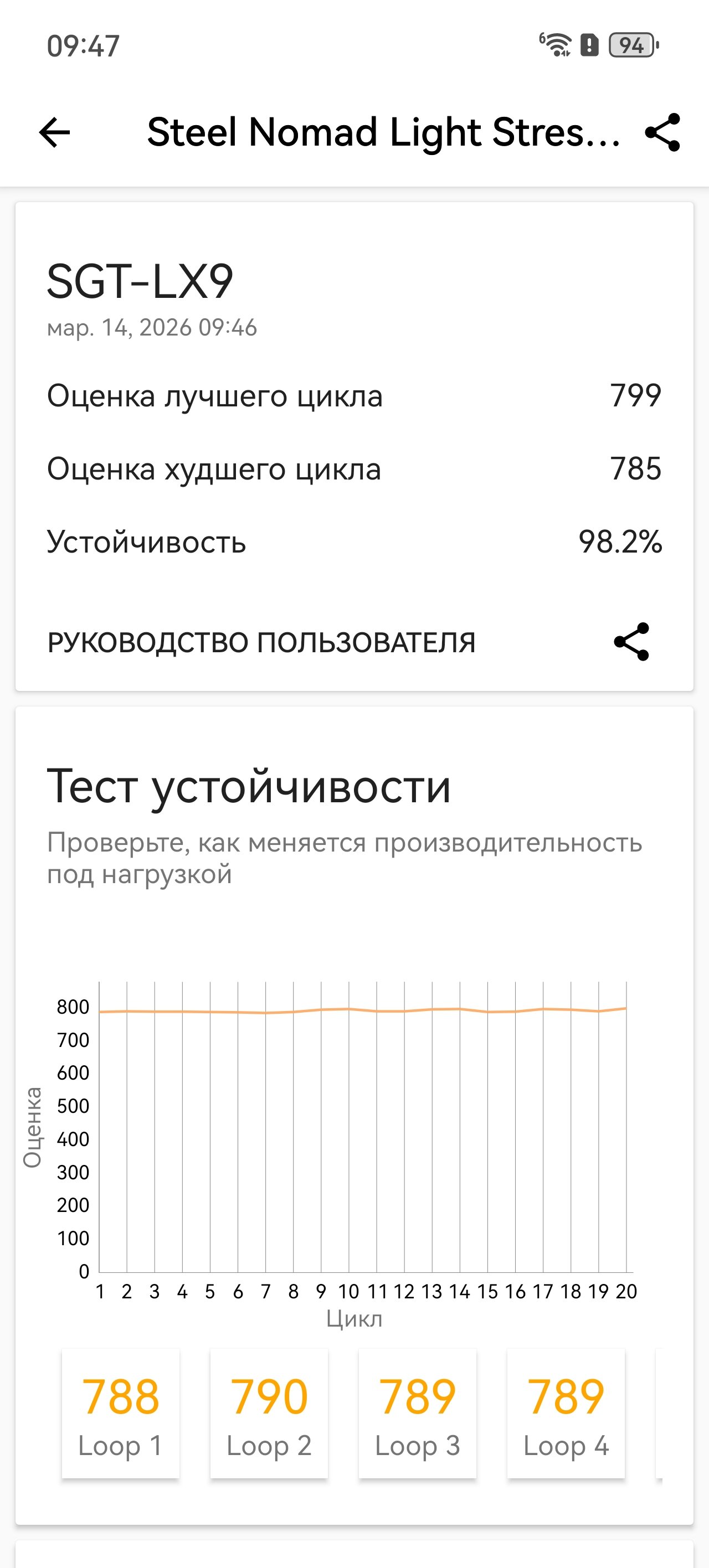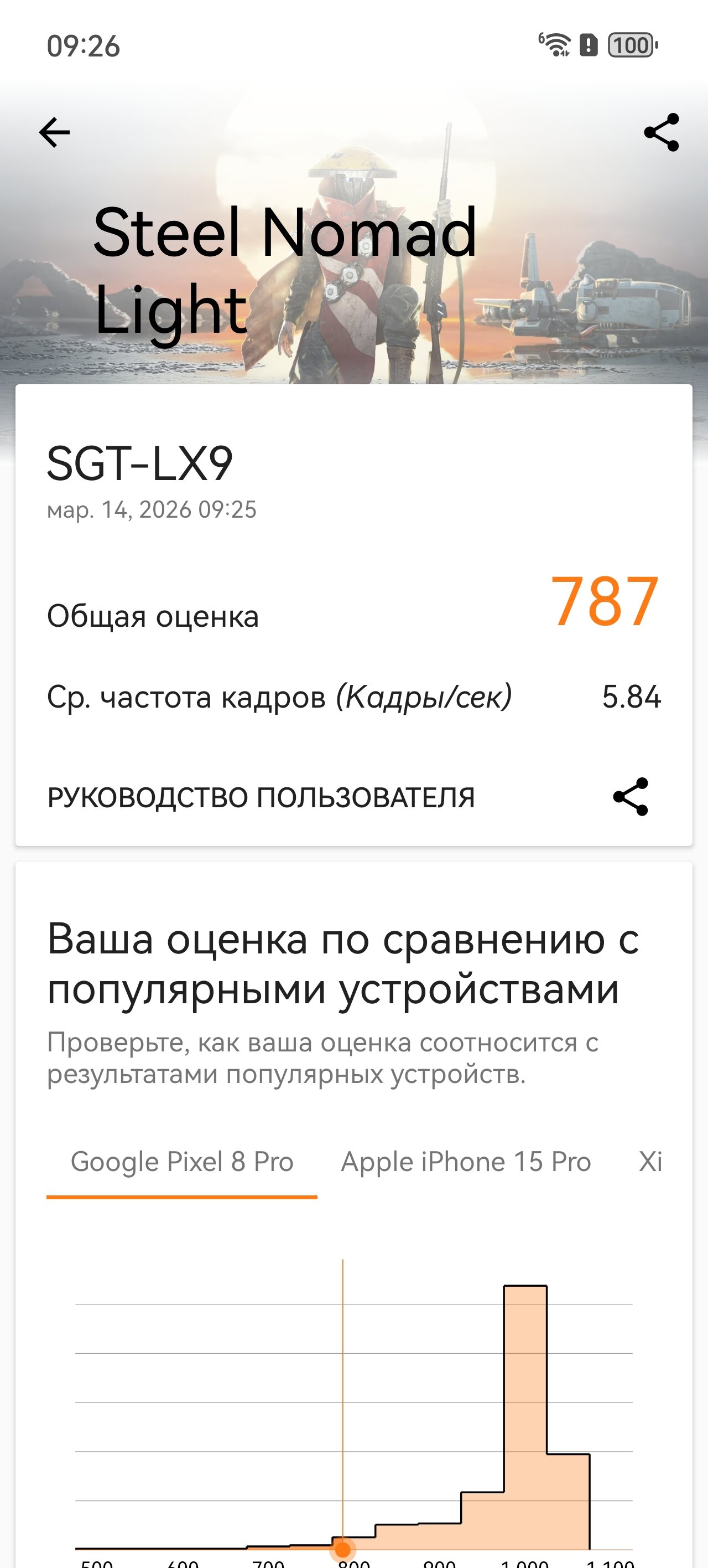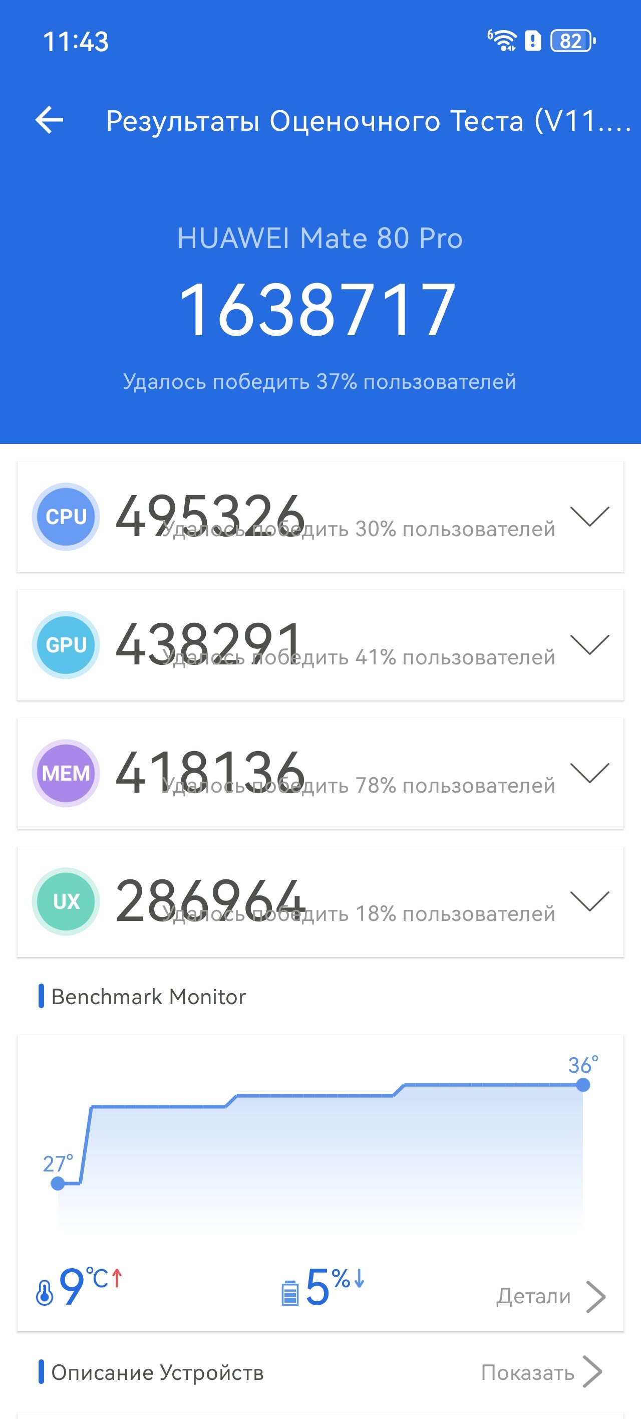 Стоит сказать, что Mate 80 Pro оборудовали продвинутой двойной системой охлаждения с фазовым переходом — производитель отмечает, что эта конструкция позволяет повысить эффективность теплоотвода на 16% по сравнению с обычными системами. Кроме того, двойная система охлаждения снижает повышение температуры устройства на 33% — всё это необходимо, чтобы система на кристалле не перегревалась в процессе выполнения тяжёлых задач. И, собственно, график стресс-теста наглядно демонстрирует, что это действительно работает. Правда, по не совсем понятной причине, чип иногда сильно сбрасывает тактовую частоту, снижая производительность до примерно 35% от первоначальной максимальной, хотя всё остальное время график держится почти на 100%.