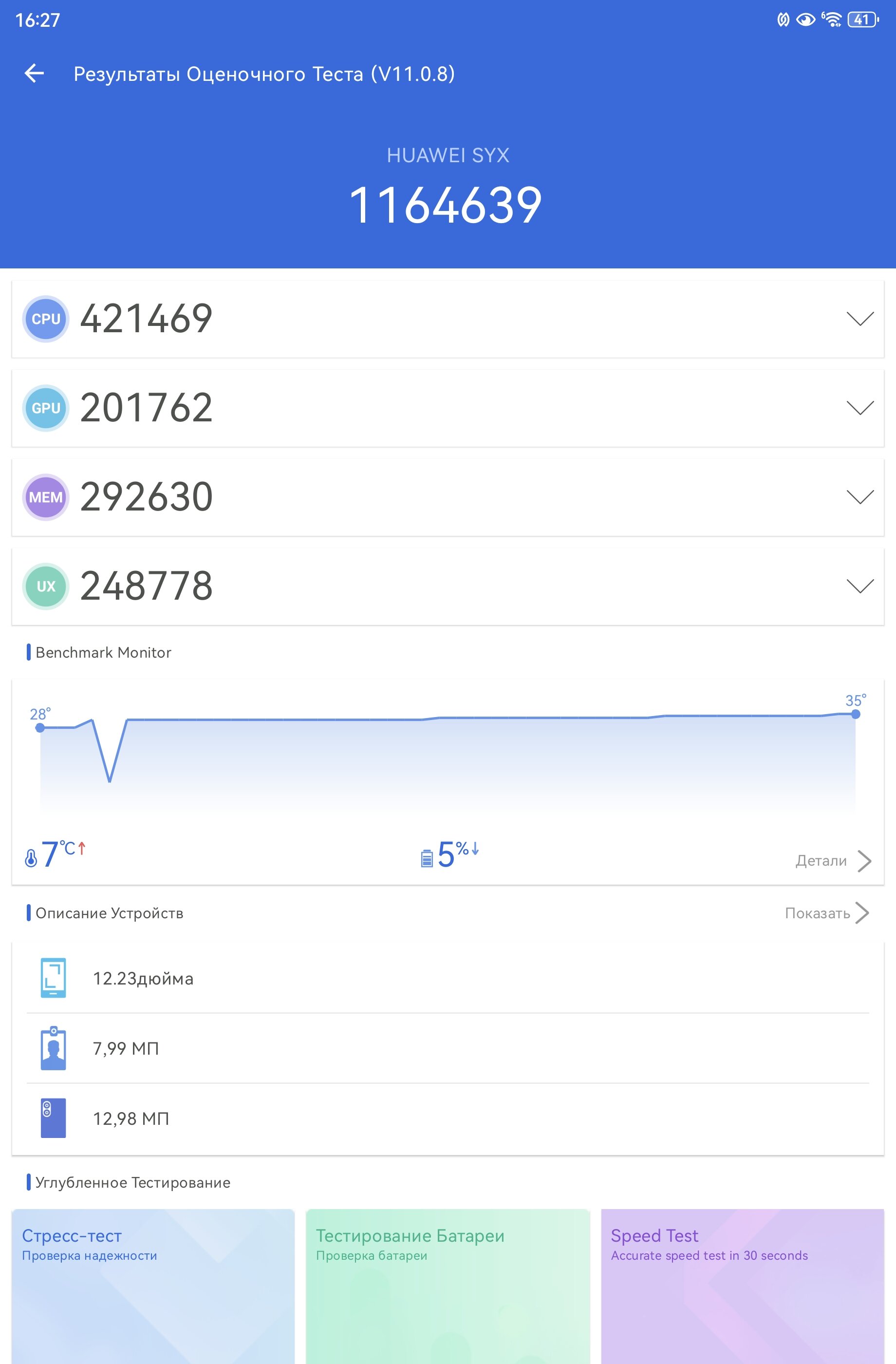 Более того, восполняет энергию батареи планшет довольно быстро — поддерживается технология скоростной зарядки SuperCharge мощностью 40 Вт, которая примерно за час позволяет зарядить устройство до 100%. Не сказать, что это самая шустрая зарядка на рынке. Да, ёмкость батареи здесь приличная, но в рамках теста проблем с набором процентов в правом верхнем углу экрана я ни разу не испытывал. Да и зарядка на 40 Вт будет не так быстро изнашивать аккумуляторную батарею, что, в теории, должно положительно сказаться на сроке службы планшета.
