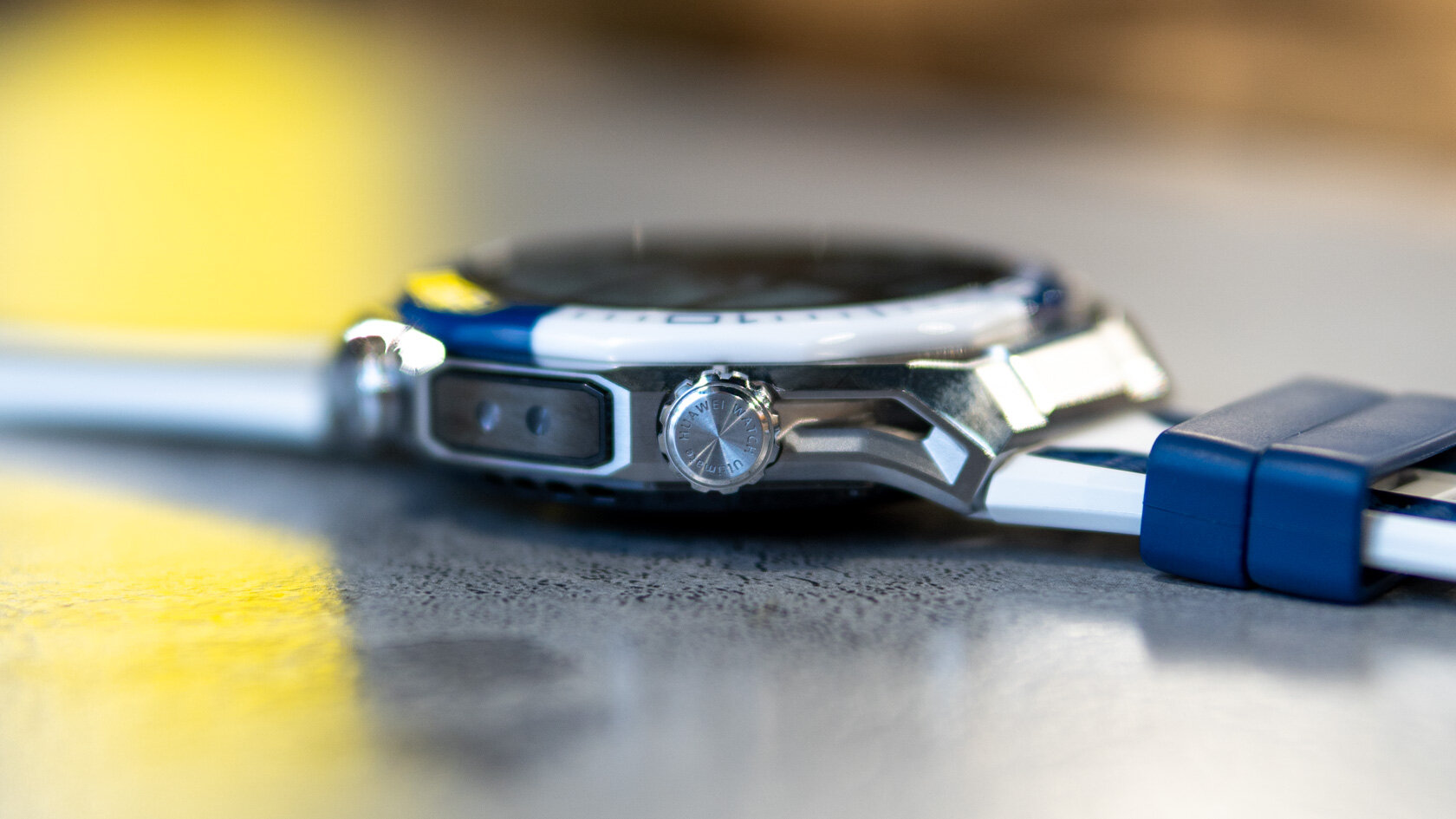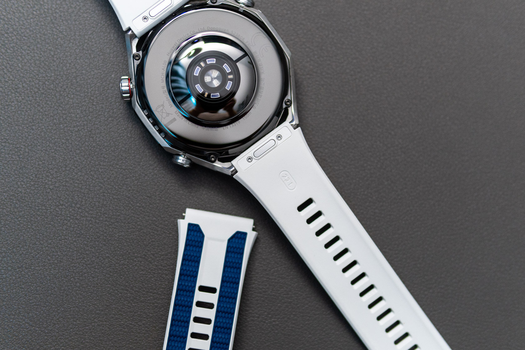 Безель умных часов, как и в первом поколении HUAWEI WATCH Ultimate, изготовлен из крайне прочной керамики и имеет двухцветное оформление — первые 15 минут выделены серо-белым цветом (в этом секторе нанесены минутные метки через каждую минуту), а весь остальной отрезок до 60 минут окрашен в синий. Такое разделение весьма полезно во время погружения, так как засекать время можно по стрелкам, а не только по цифровым индикаторам.