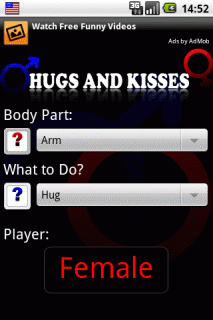 Hugs And Kisses — эротическая игра для Android, в которую нужно играть как минимум вдвоем. Программа случайным образом выбирает часть тела и что нужно сделать. Например, поцеловать шею или нежно укусить за ушко.