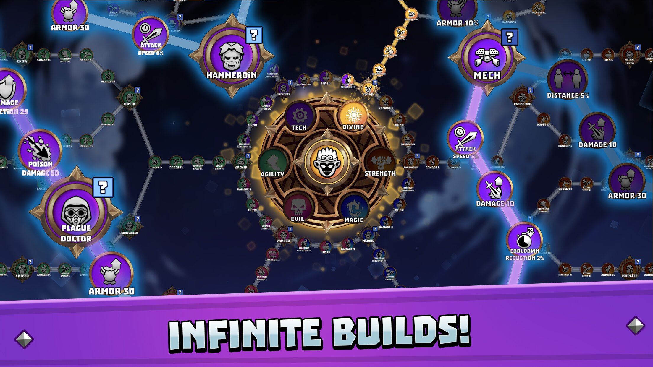 - Шесть стартовых классов с гибридными билдами
