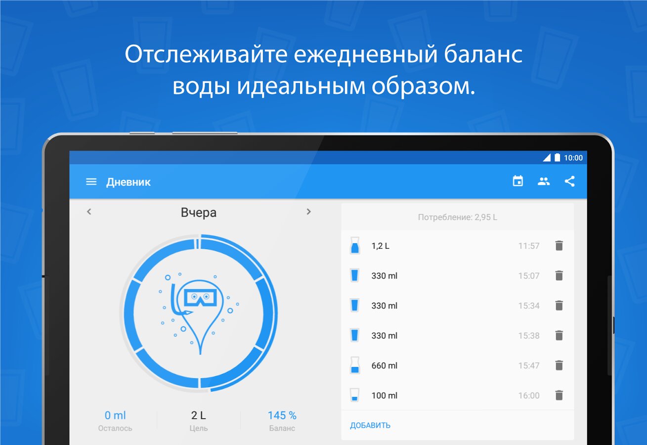 Узнав наш возраст и пол, поинтересовавшись весом и информацией о единоразовом приеме воды, программа быстро подсчитывает, сколько жидкости необходимо употреблять в течение дня и с каким интервалом это нужно делать. После этого мы попадаем в простое меню, где должны записывать все ее приемы.