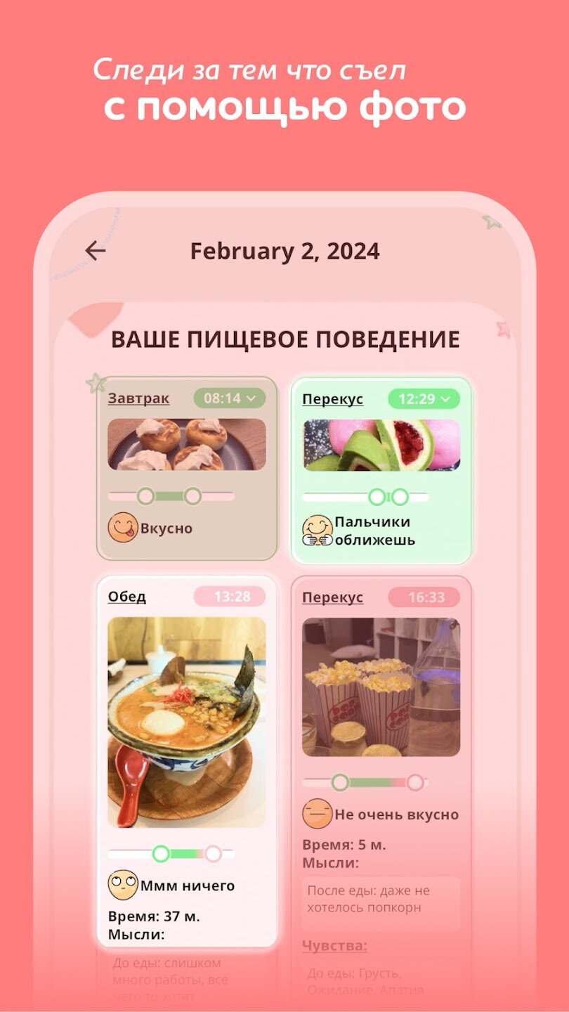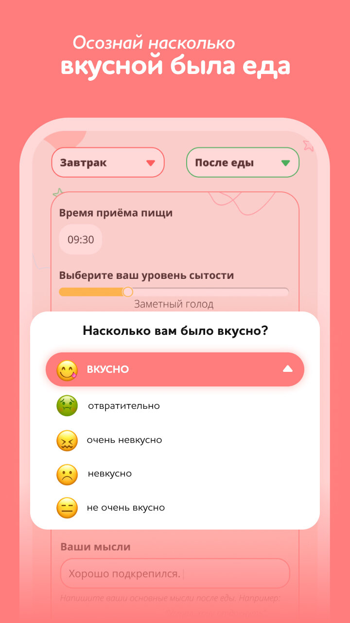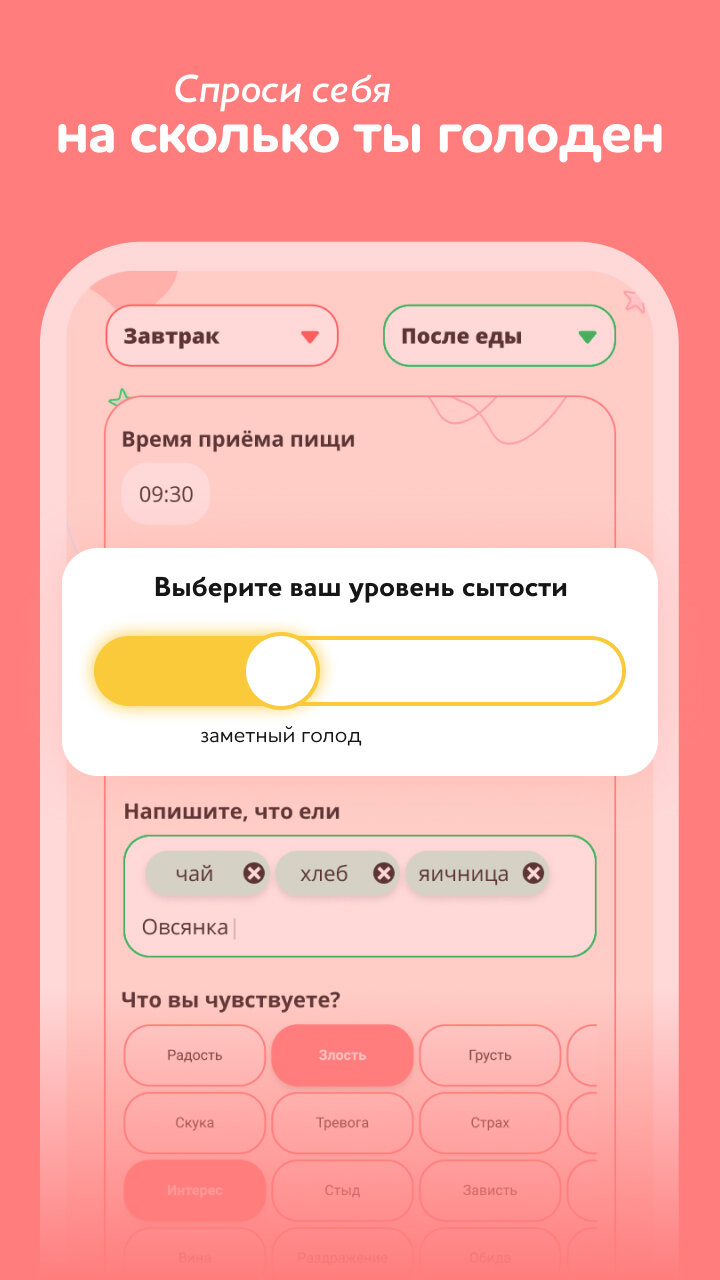 I feel food — трекер осознанного питания разработанный при участии психологов поможет наладить отношения с едой. Удобная шкала голода/сытости и принятие своих эмоций помогут остановить переедания.