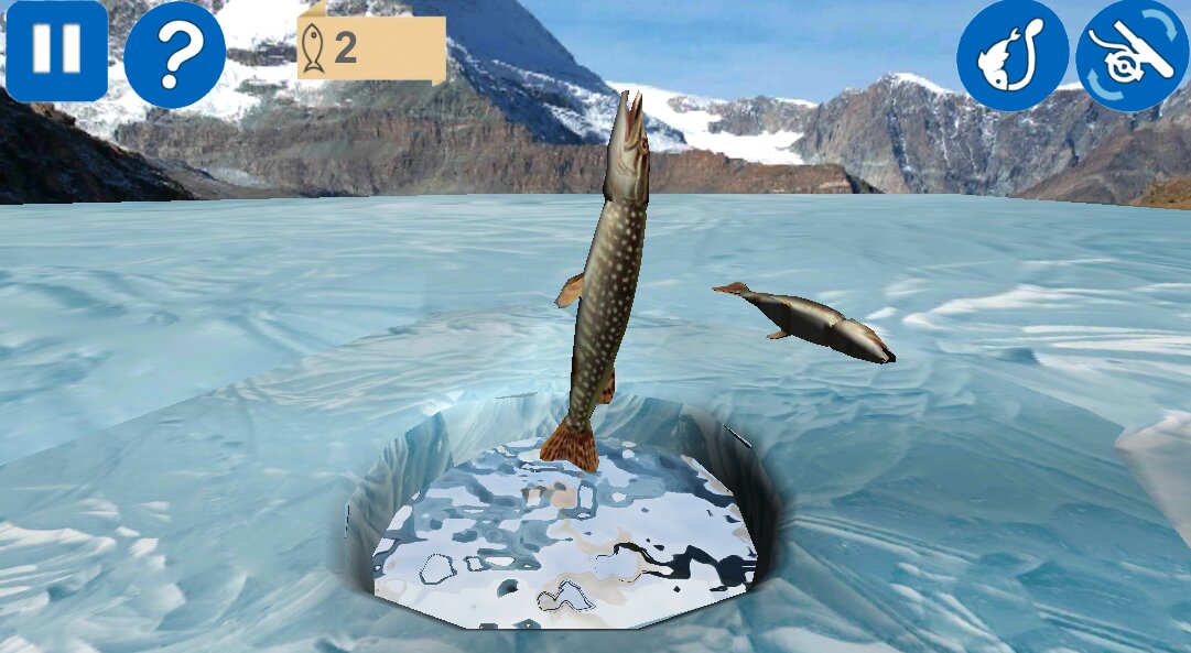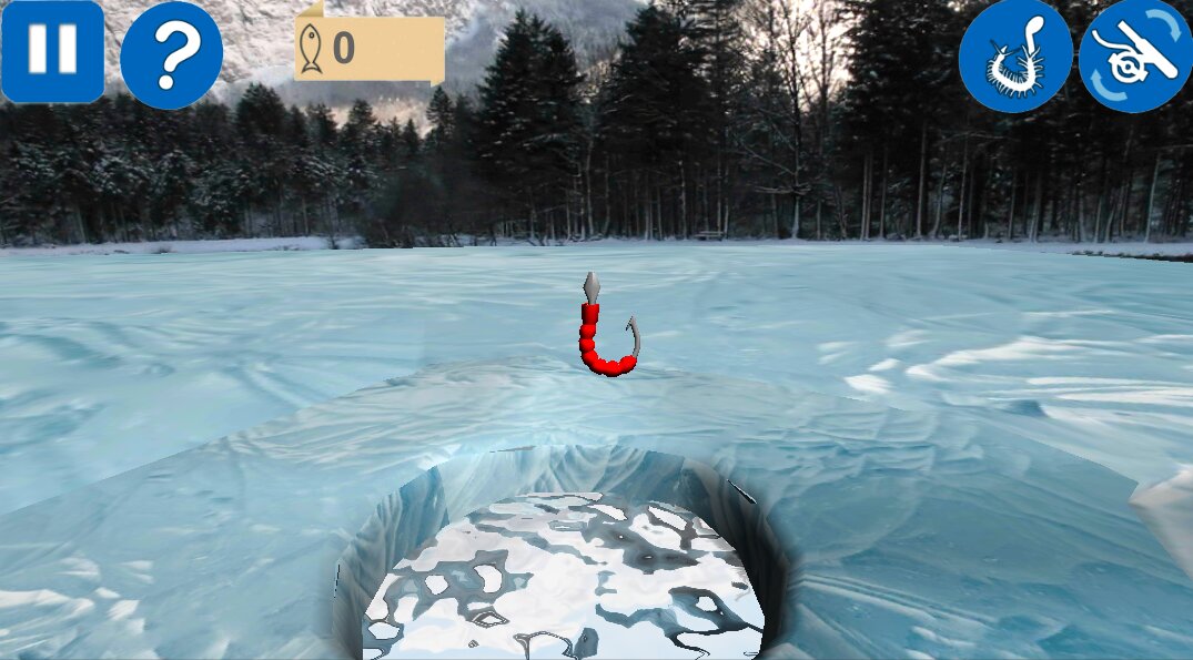 Рыбалка зимняя 3D — чтобы поймать рыбу, тебе необходимо проверить есть ли наживка на крючке. Для этого достань снасти, нажми на иконку «катушки» в правом верхнем углу. Если крючок пустой, насади наживку. Иконка «крючка с наживкой» рядом с иконкой «катушки». Если ты выбрал тип игры «матч», тогда можешь менять наживку, нажимая на иконку крючка с наживкой снова.