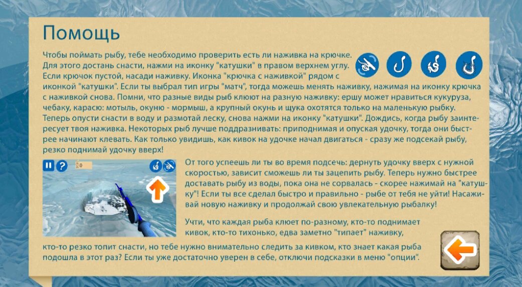 Учти, что каждая рыба клюет по-разному, кто-то поднимает кивок, кто-то тихонько, едва заметно «типает» наживку, кто-то резко топит снасти, но тебе нужно внимательно следить за кивком, кто знает какая рыба подошла в этот раз? Если ты уже достаточно уверен в себе, отключи подсказки в меню «опции».