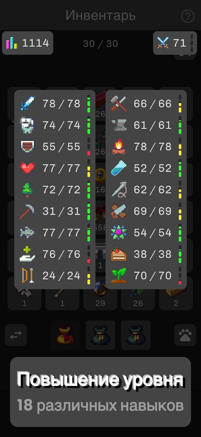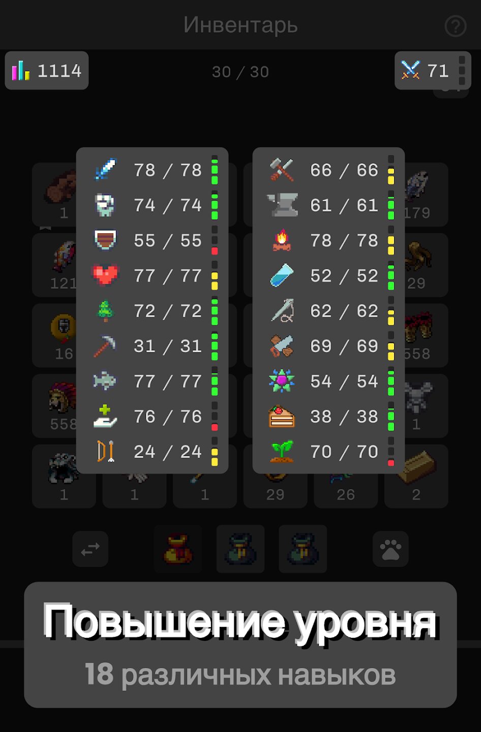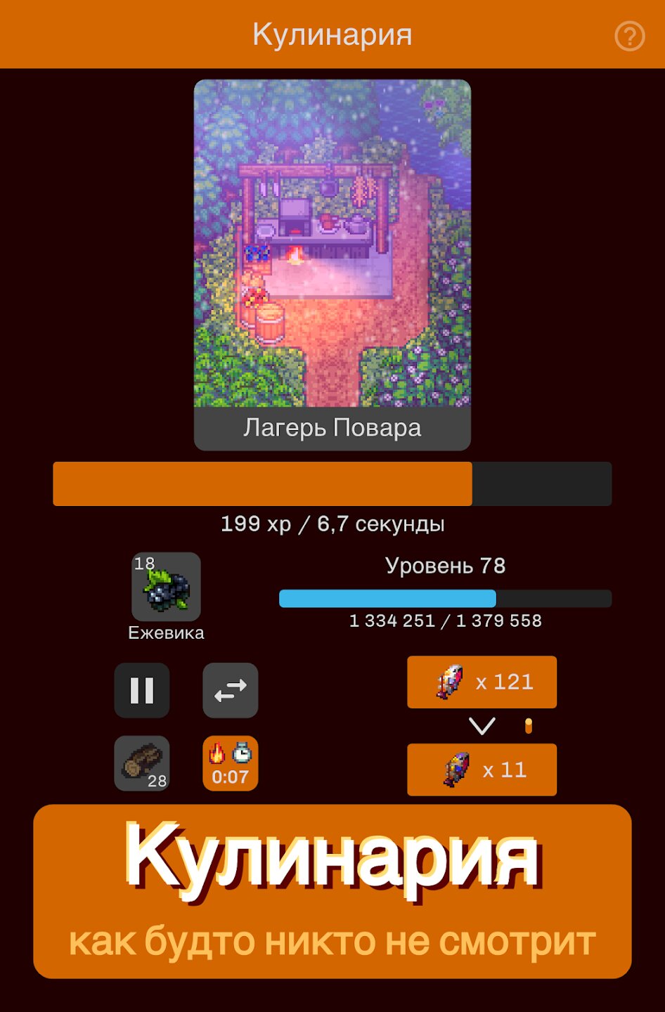 - Гибридный игровой процесс, сочетающий инкрементную механику простоя с традиционным повышением уровня навыков в RPG.