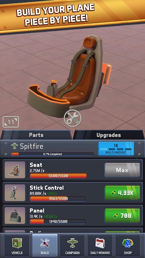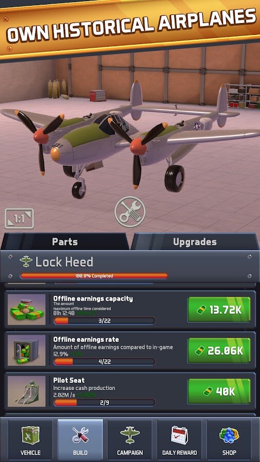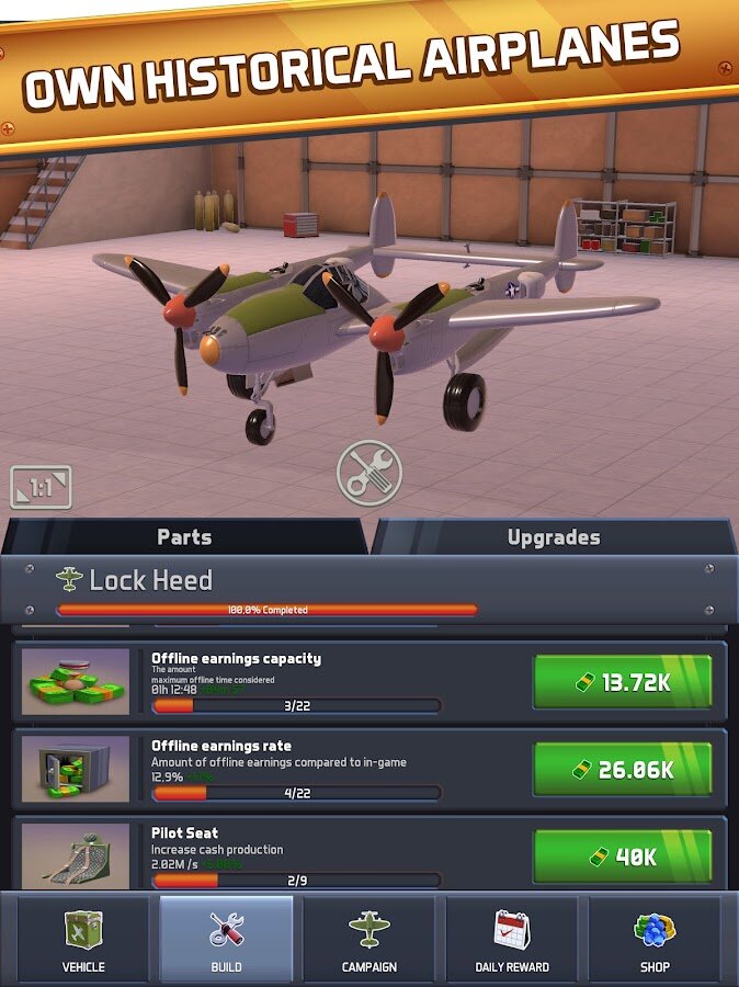 Idle Planes – создайте свои собственные небесные крылья, реактивный пилот ВВС. Создавайте мощные летательные аппараты из разрозненных деталей, собирайте новые детали и собирайте совершенно новые реактивные самолеты, от которых у вас захватит дух! Зарабатывайте деньги на своих творениях воздушных асов, чтобы покупать новые ресурсы и создавать еще более впечатляющие летательные аппараты на заказ. Насколько большую и мощную коллекцию самолетов ВВС вы сможете собрать?