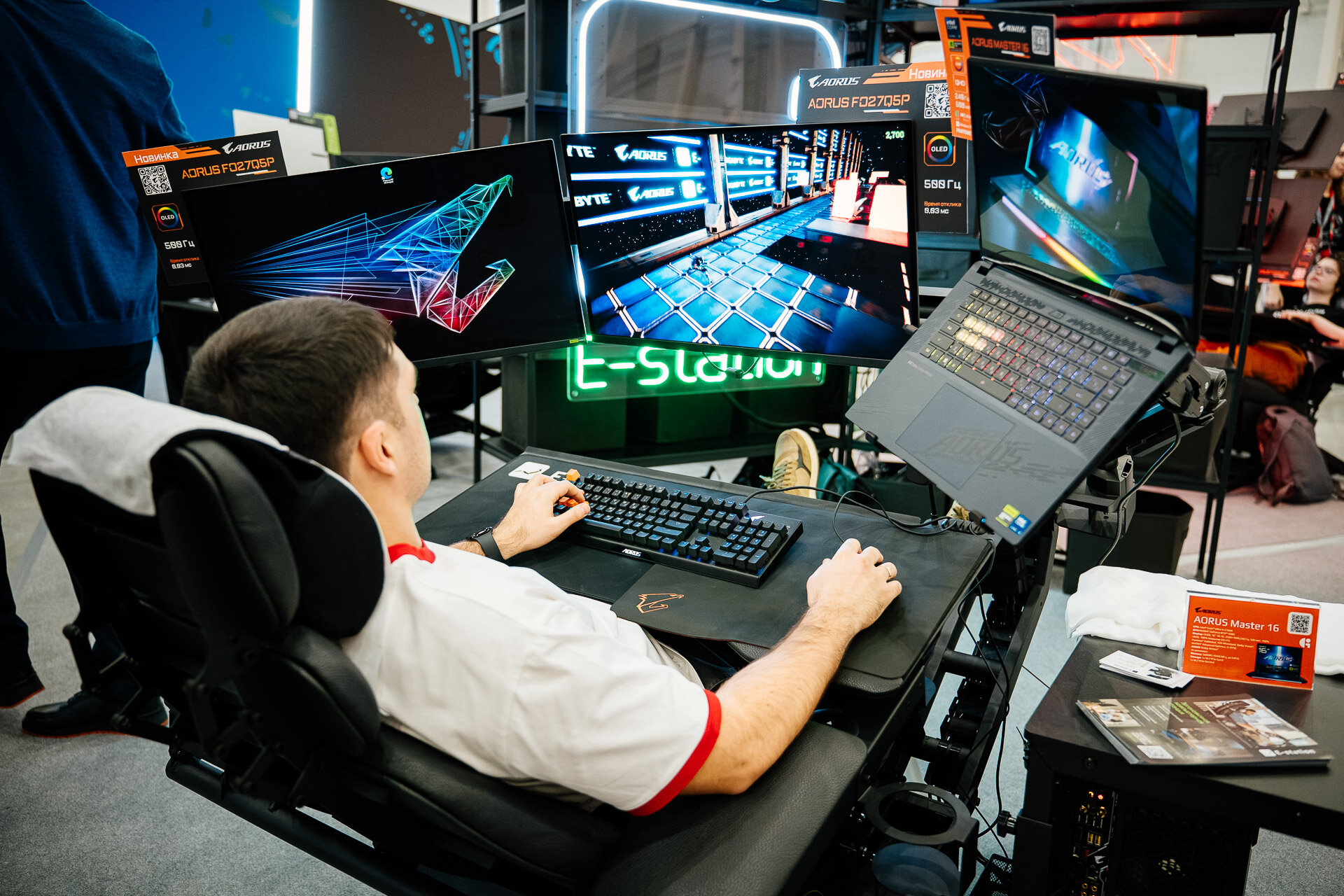 Впрочем, помимо традиционных игровых сетапов на выставке показали и нечто довольно необычное — компания E-station организовала рабочее место с удобным киберспортивным креслом, на котором можно практически лежать во время работы или прохождения любимых игр. Данное рабочее пространство для полноты картины представители E-station оснастили новейшими геймерскими мониторами и ноутбуками бренда AORUS (суббренд Gigabyte).