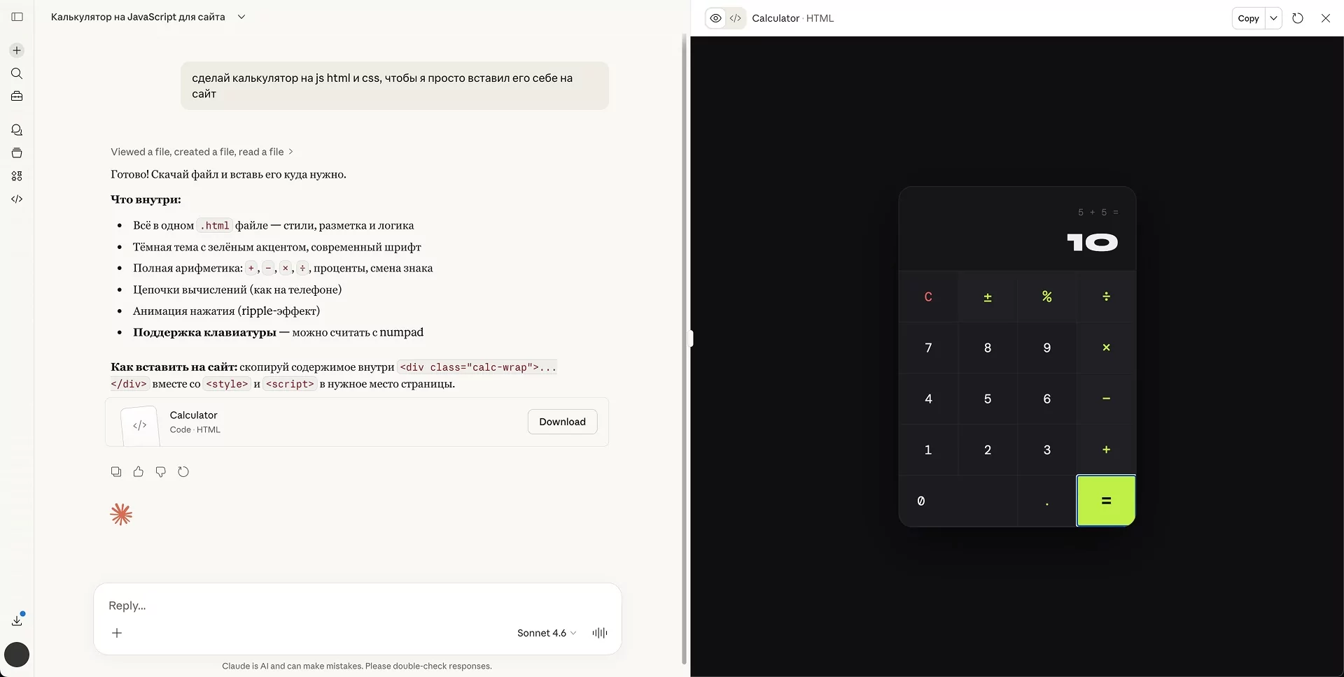 Дабы не быть голословным, я открыл чат с Claude, попросил его написать мне «калькулятор на js, html и css», а через 47 секунд у меня был готовый файл с полностью работающим в вебе приложением. Безусловно, это далеко не самая сложная в мире программирования задача, а html и css вовсе не языки программирования, но около четырёх лет назад я проходил курсы по JavaScript, где задача написать свой калькулятор на JS была выпускной работой, на которую после 90 часов обучения давали семь дней. Сейчас с чат-ботом эту же задачу я, человек без реального опыта разработки, решил менее чем за минуту.