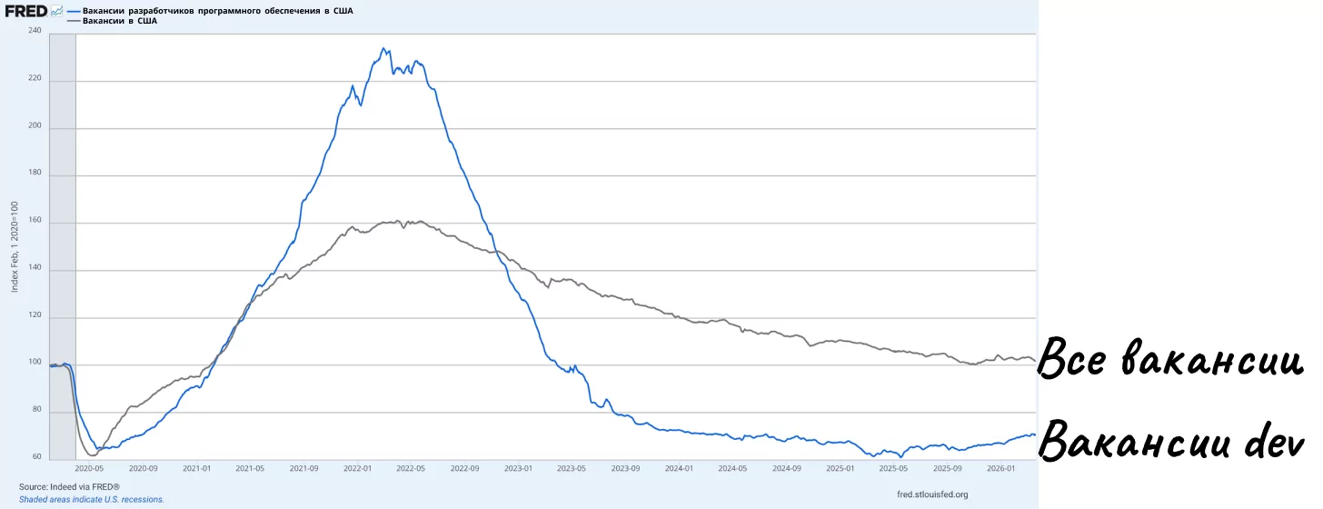 Соответственно, пользователей, которые способны посредством ИИ писать относительно сносный код, стало очень много, но, что довольно интересно, количество вакансий в сфере программирования при этом постоянно снижается — просто колоссальными темпами. Для наглядности предлагаю изучить этот график, опубликованный специалистами из Federal Reserve Economic Data (база данных экономической статистики США).