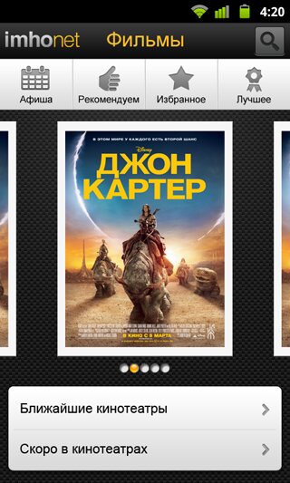 «На главной странице приложения доступны фильмы, которые сейчас идут в кино, а также список ближайших кинотеатров с расписанием и контактными телефонами.
