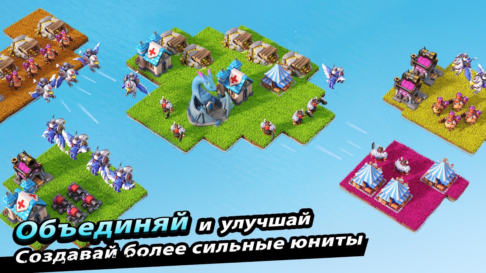 - Мгновенное улучшение. Будь то здания или боевые отряды, просто соединяйте и улучшайте их. Больше никакого утомительного ожидания. Погрузитесь в захватывающий процесс развития клана!