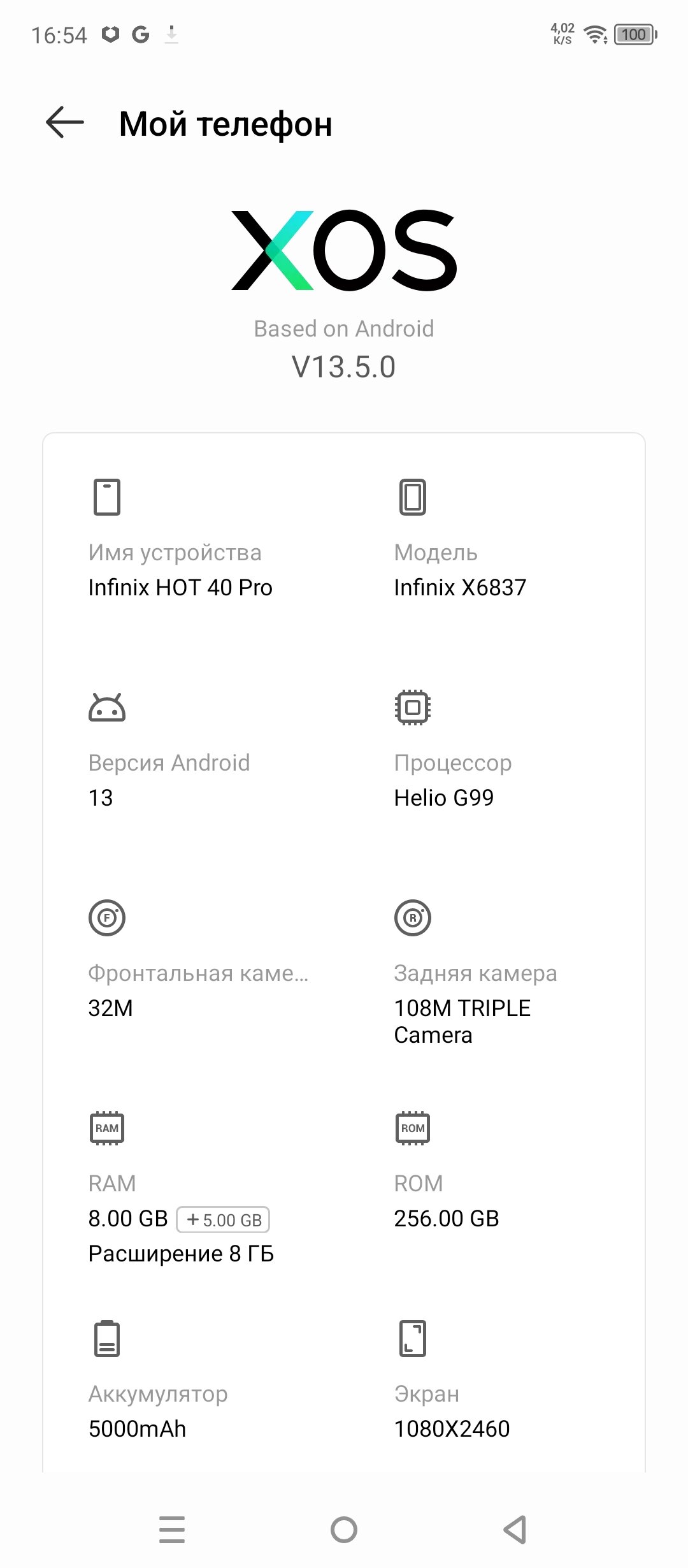 Оболочка на базе Android 13 обновилась до версии XOS 13.5 без существенных изменений в оформлении. Мое личное мнение об оболочке: визуально она сильно отличается от виденья Google, но с функциональным наполнением полный порядок, поэтому пользоваться удобно после небольшой адаптации. По отзывчивости всё отлично, XOS сама по себе работает хорошо, а у HOT 40 Pro ещё и железо весьма производительное.