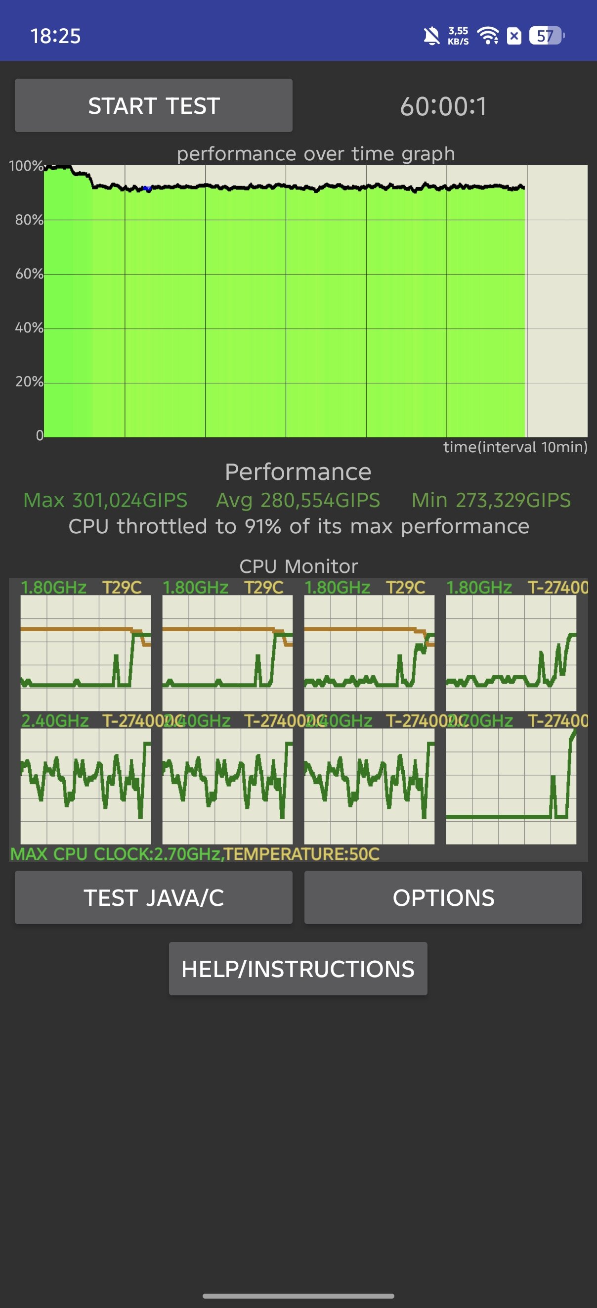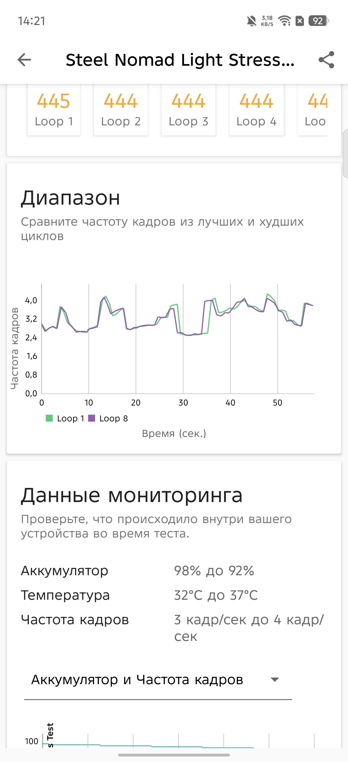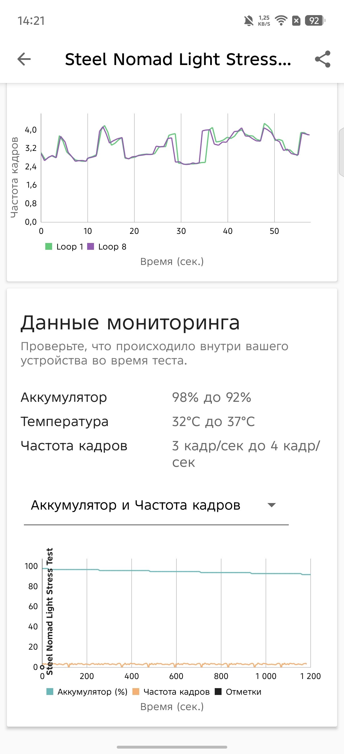 С охлаждением у смартфона проблем не возникает — это не может не радовать. Здесь расположена испарительная камера площадью 4758 мм², плюс за пассивное рассеивание тепловой энергии отвечает цельнометаллический алюминиевый корпус, он равномерно распределяет тепло. В результате гаджет поддерживает высокий уровень производительности даже в случае с длительными нагрузками в стресс-тестах. Безусловно, чип слегка сбросил тактовую частоту, но произошло это относительно плавно. Без специальных замеров снижение общей производительности заметить будет невозможно.