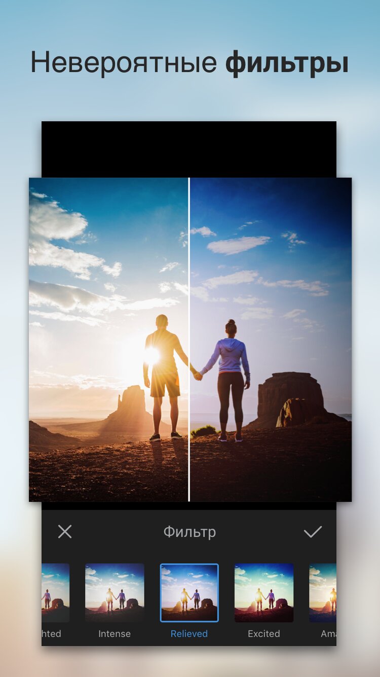 - Десятки цветовых фильтров для создания настроения и улучшения любой фотографии.
