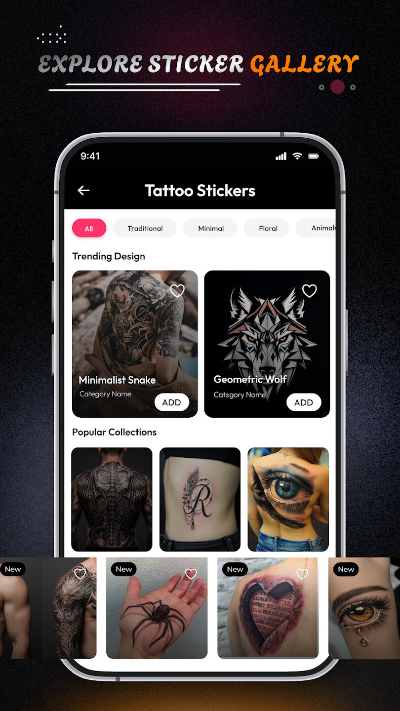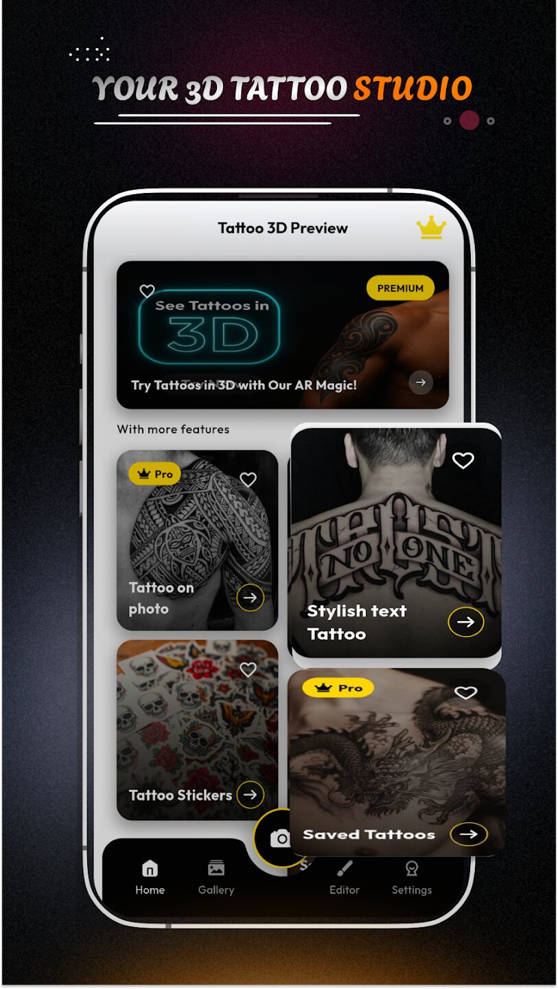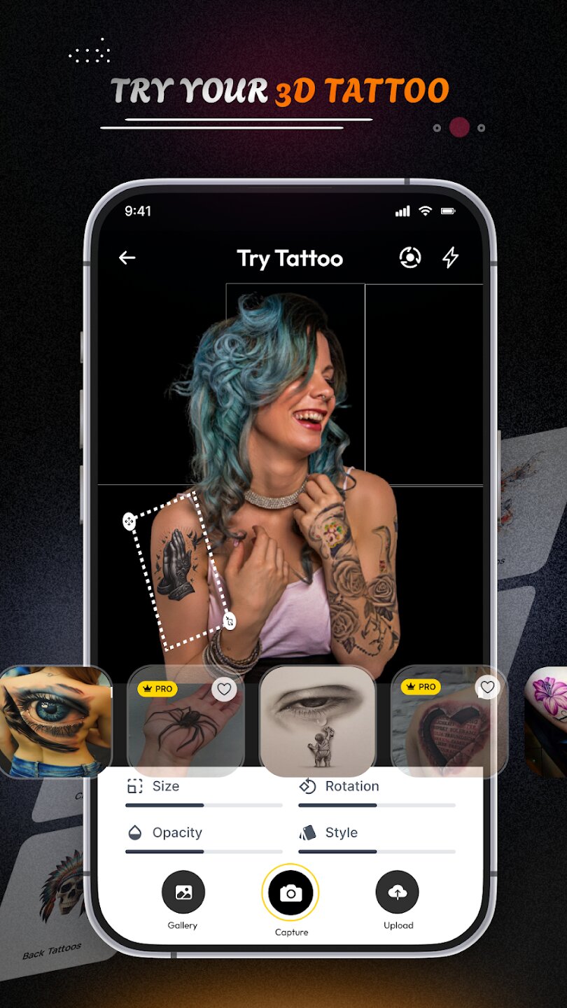 - Предварительный просмотр в режиме реального времени с помощью дополненной реальности (AR) для визуализации татуировок на вашей коже.