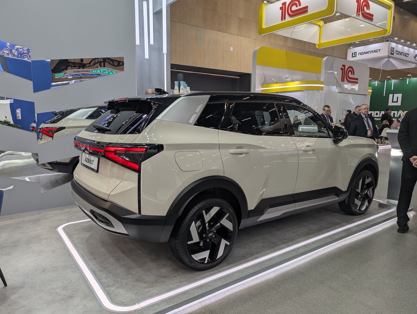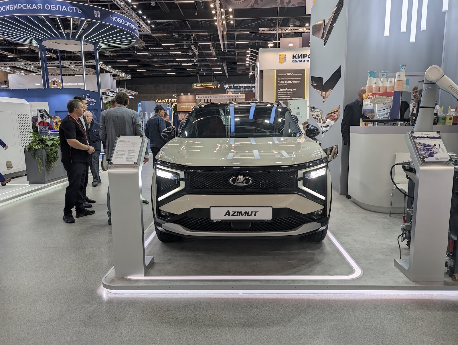 А компания «АвтоВАЗ» на выставке показала российский кроссовер LADA Azimut — кузов визуально выглядит очень симпатично, особенно фары и стоп-сигналы. При этом модель довольно крупная и с высокой линией капота — сразу и не скажешь, что этот автомобиль построили на базе LADA Vesta.