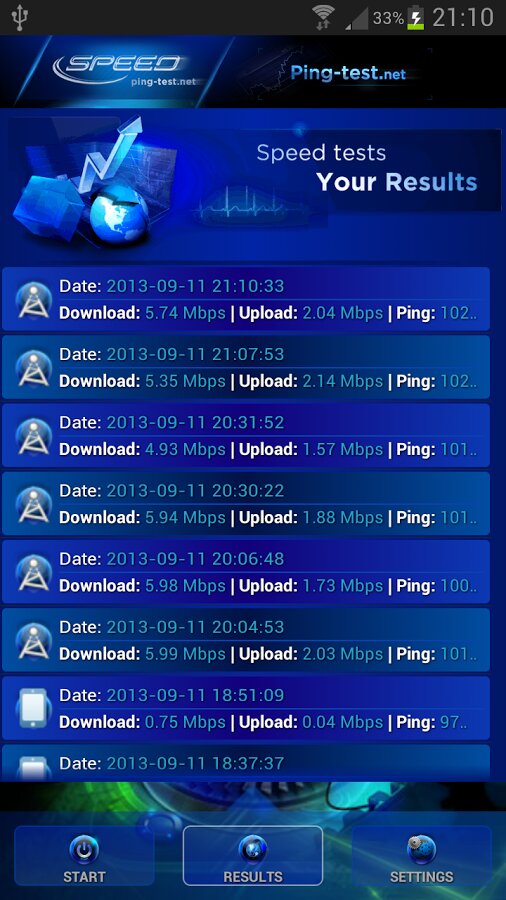 - детализированная информация о тестировании (значения скоростей download/upload/ping, тип соединения, дата, параметры)