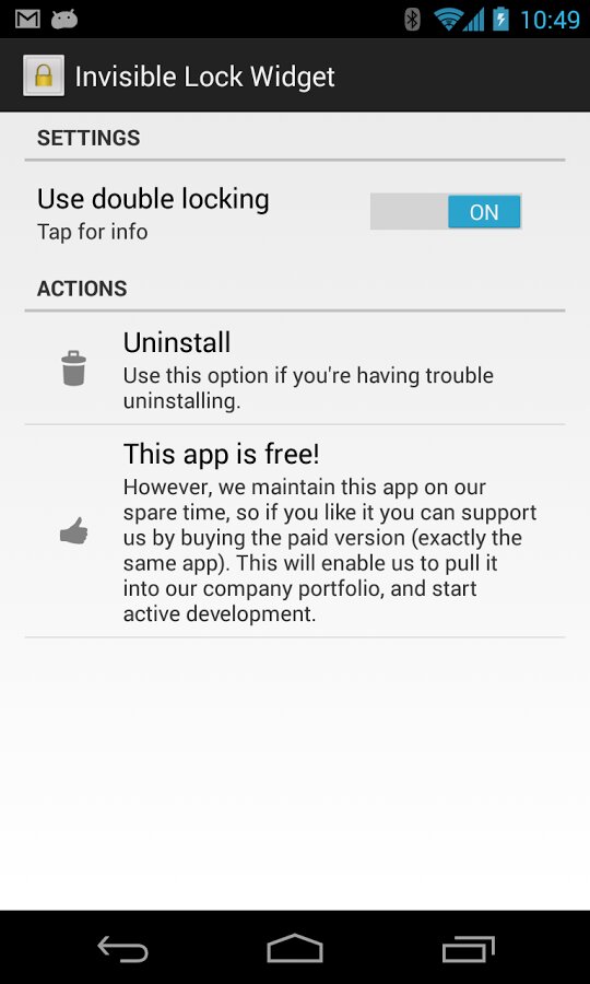 Возможность добавить на рабочий стол невидимый виджет блокировки 1x1 или 4x1. После добавления ищем на экране методом тыка. При удалении снимаем галку напротив программы в настройки > безопасность > администрирование устройства. Для Android 2.2 и выше.