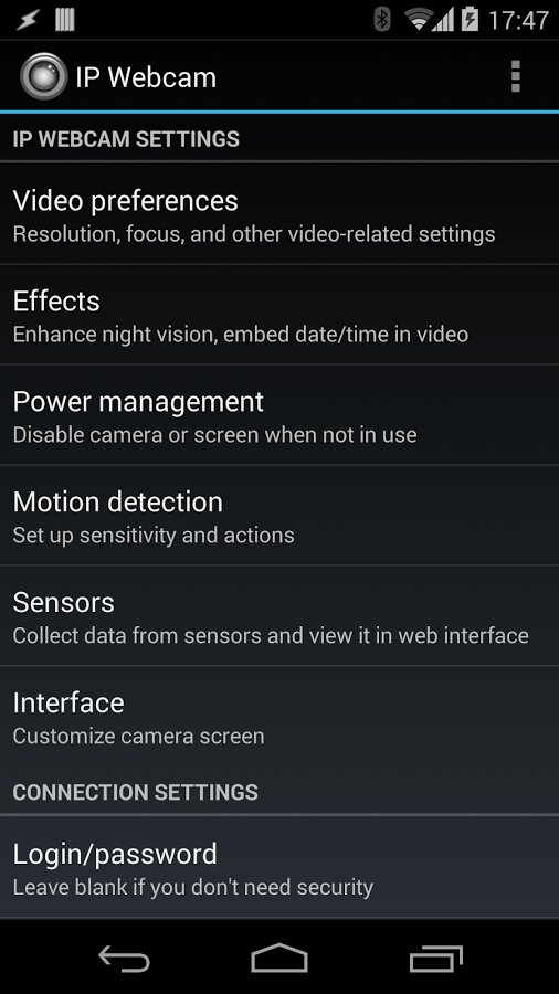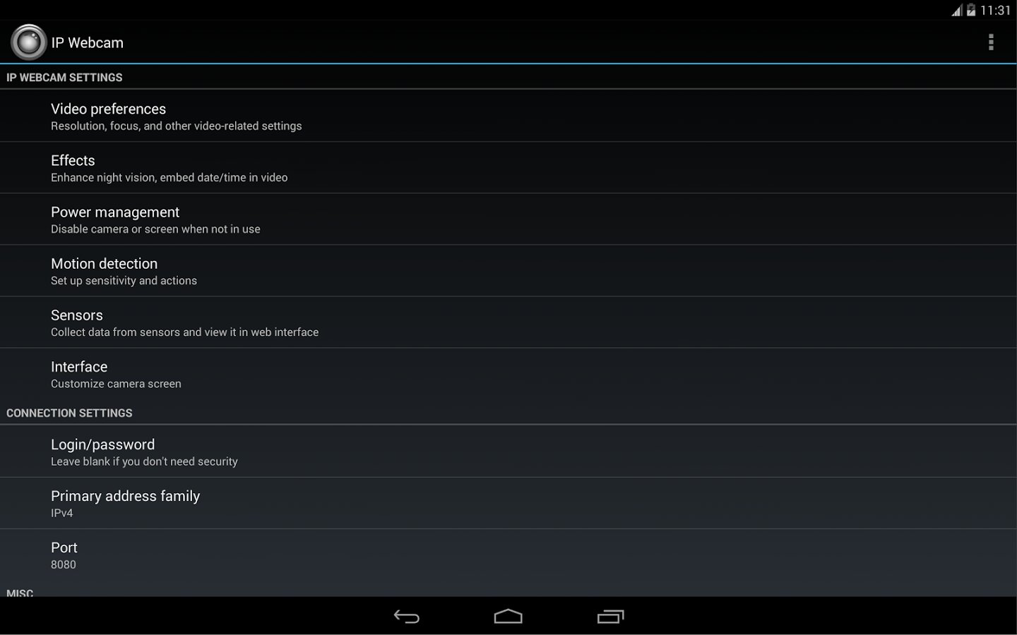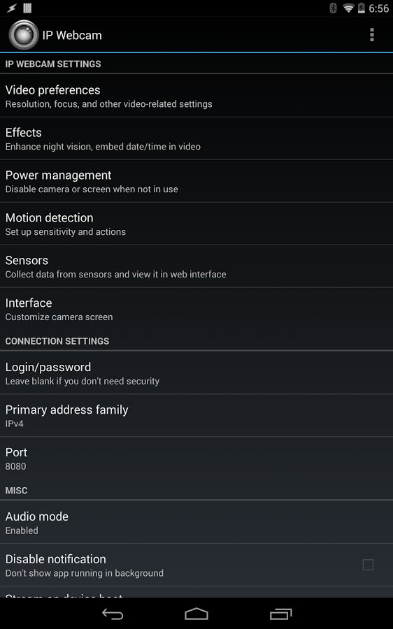 IP Webcam — превращает ваш аппарат в сетевую камеру с множеством вариантов просмотра. Нет необходимости в привязанном к вашей ОС клиенте, просматривать можно в браузере или VLC-плеере (в Windows Media Player и The KMPlayer не заработало). Может работать как скрытая камера в фоновом режиме. Поддерживается использование в видеочате (например Skype, но только в Windows (при попытке запуска рубит Skype 5.0)).