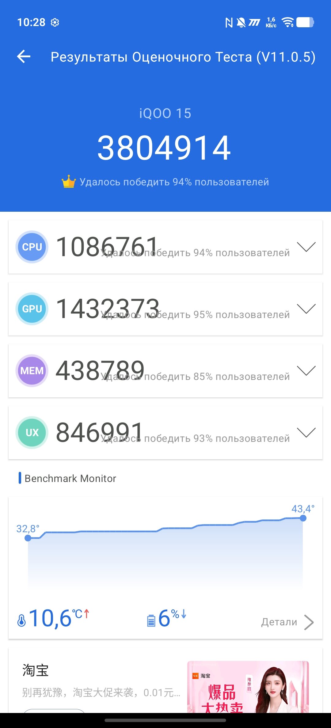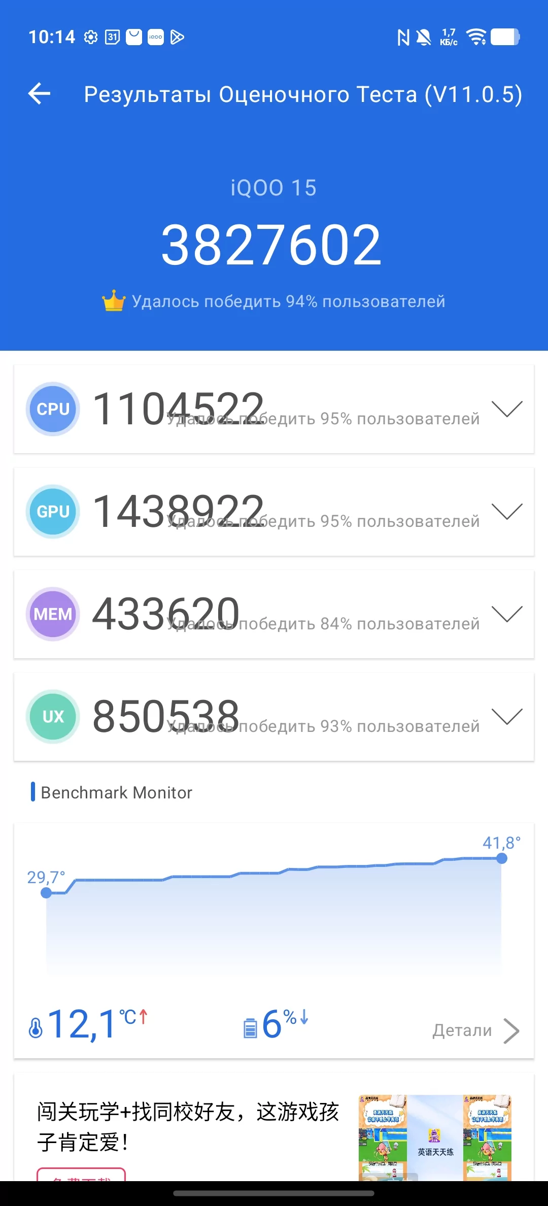 Как бы там ни было, давайте перейдём к тестам — здесь нет никаких сюрпризов, ведь у iQOO 15 одна из самых мощных начинок на рынке, так что циферки в синтетических тестах ожидаемо одни из самых высоких на данный момент.