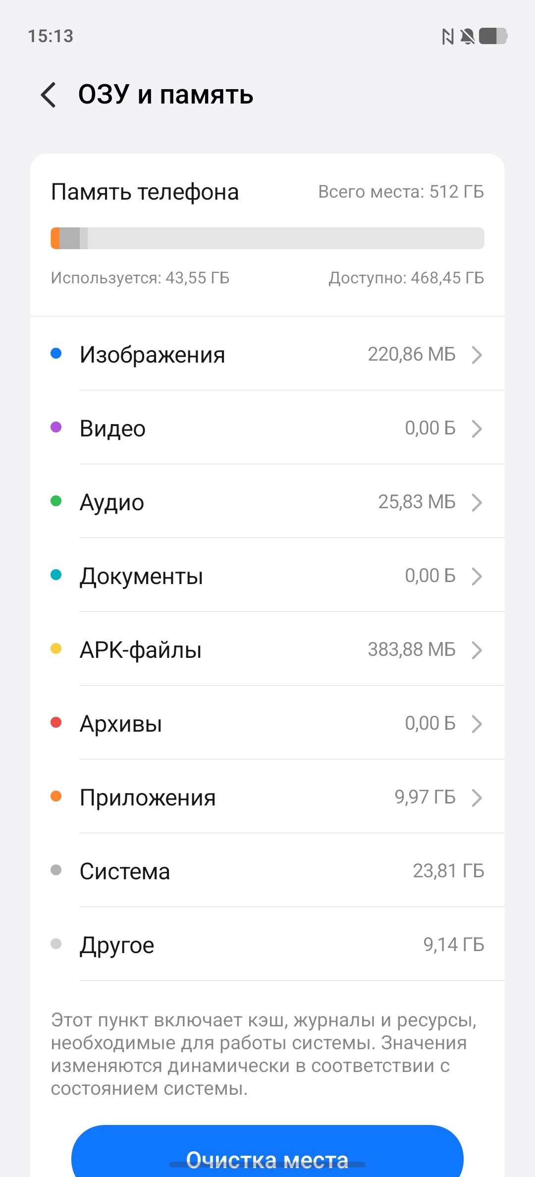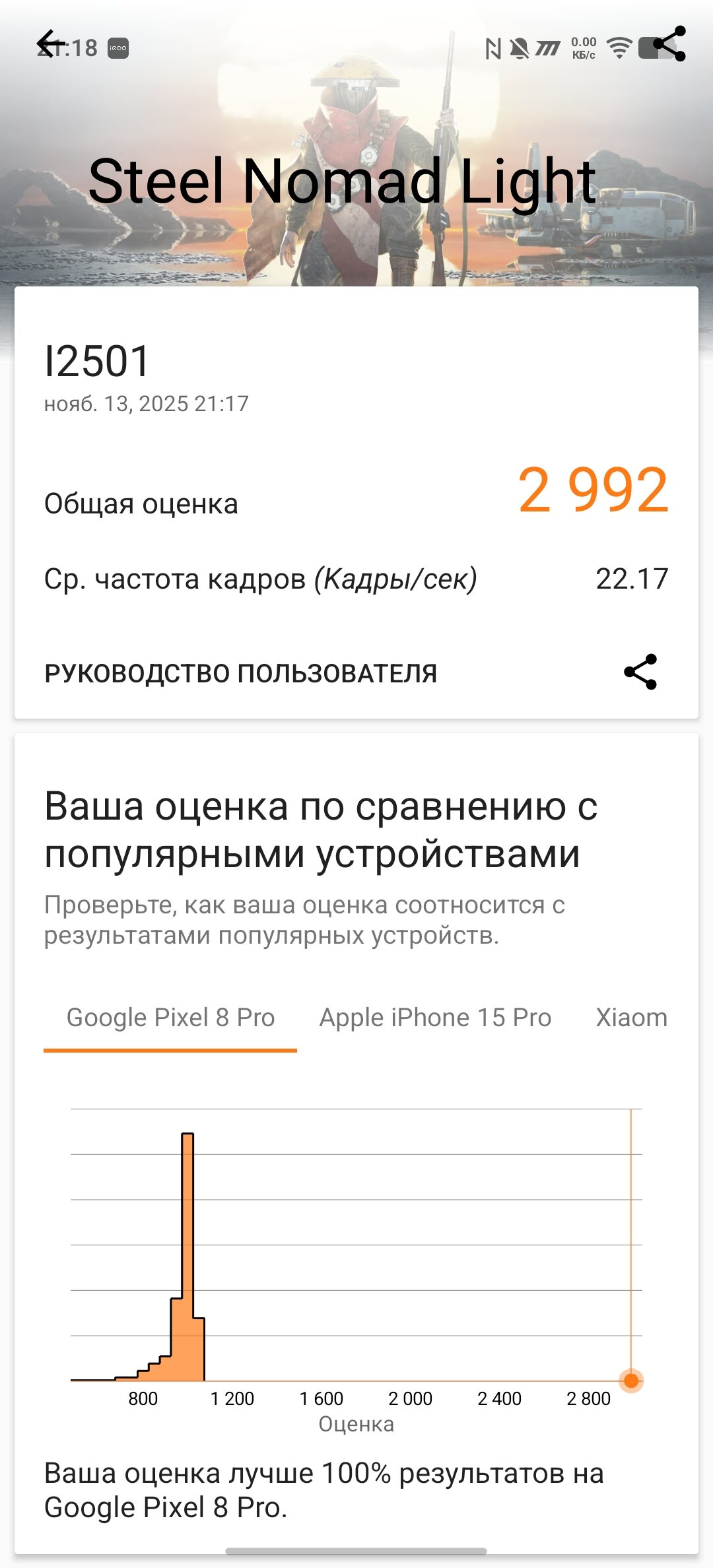 Чипсет работает в связке с 12 или 16 ГБ оперативной памяти и хранилищем типа UFS 4.1 на 256 или 512 ГБ. Обратите внимание, что максимально быстрая (9600 Мбит/с) оперативная память — стандарта LPDDR5X Ultra — будет только в версии на 16/512 ГБ (у меня на обзоре как раз такая). А вот стандарт ОЗУ в базовой модификации производитель не раскрывает.