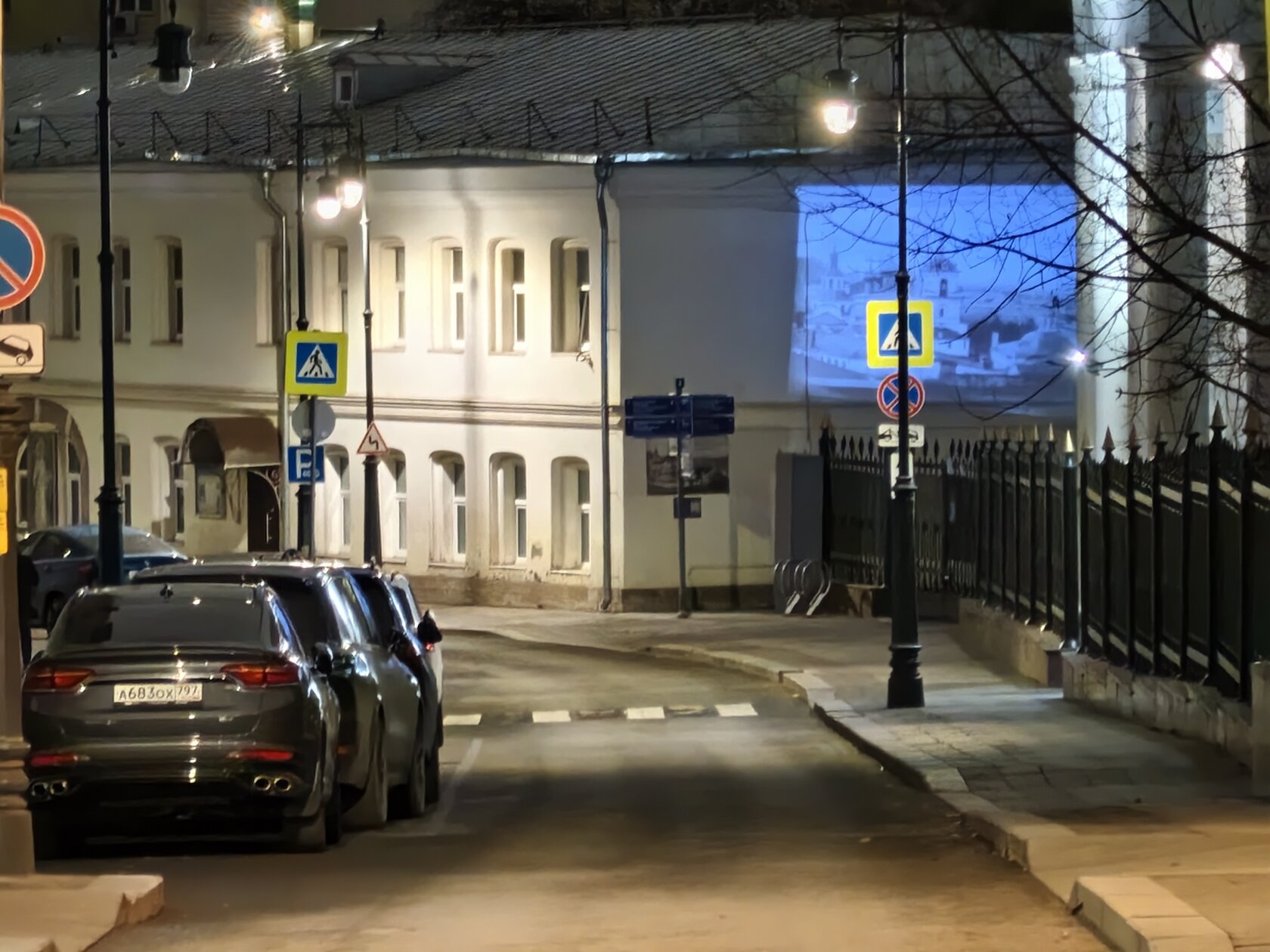 Ночью основная камера выдаёт такие же превосходные камеры, как и днём: без каких-либо проблем с резкостью, динамическим диапазоном или излишним высветлением тёмных сцен. Кадры с зумом 2× уже не один в один с зумом 1×, какими получаются днём, и это понятный результат — всё-таки оптика прежняя, а условия куда более тяжёлые. Выделенная же камера для съёмки в 3× справляется хорошо как с диапазоном цветов, так и с детализацией и резкостью. Снимки в 10× получаются ожидаемо посредственными на фоне меньших зумов — ночные снимки многократно хуже дневных. А вот у широкоугольной камеры ситуация, на удивление, не такая, поскольку ночные снимки, по меркам таких камер, можно назвать достаточно приличными.