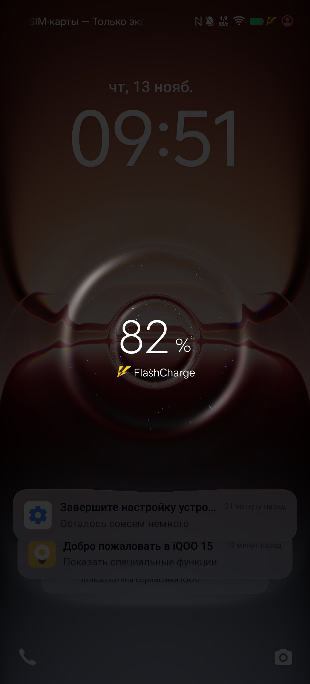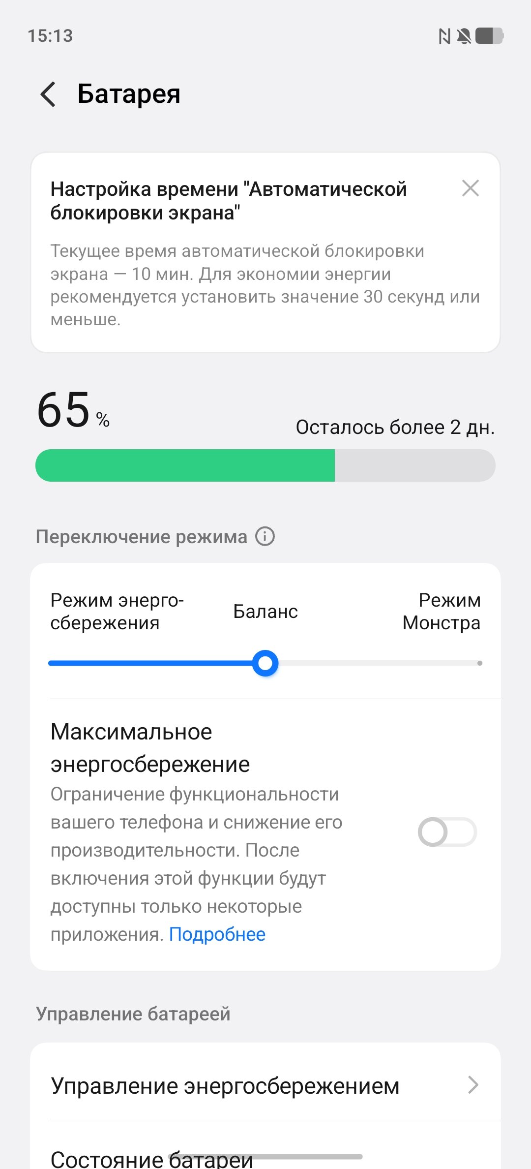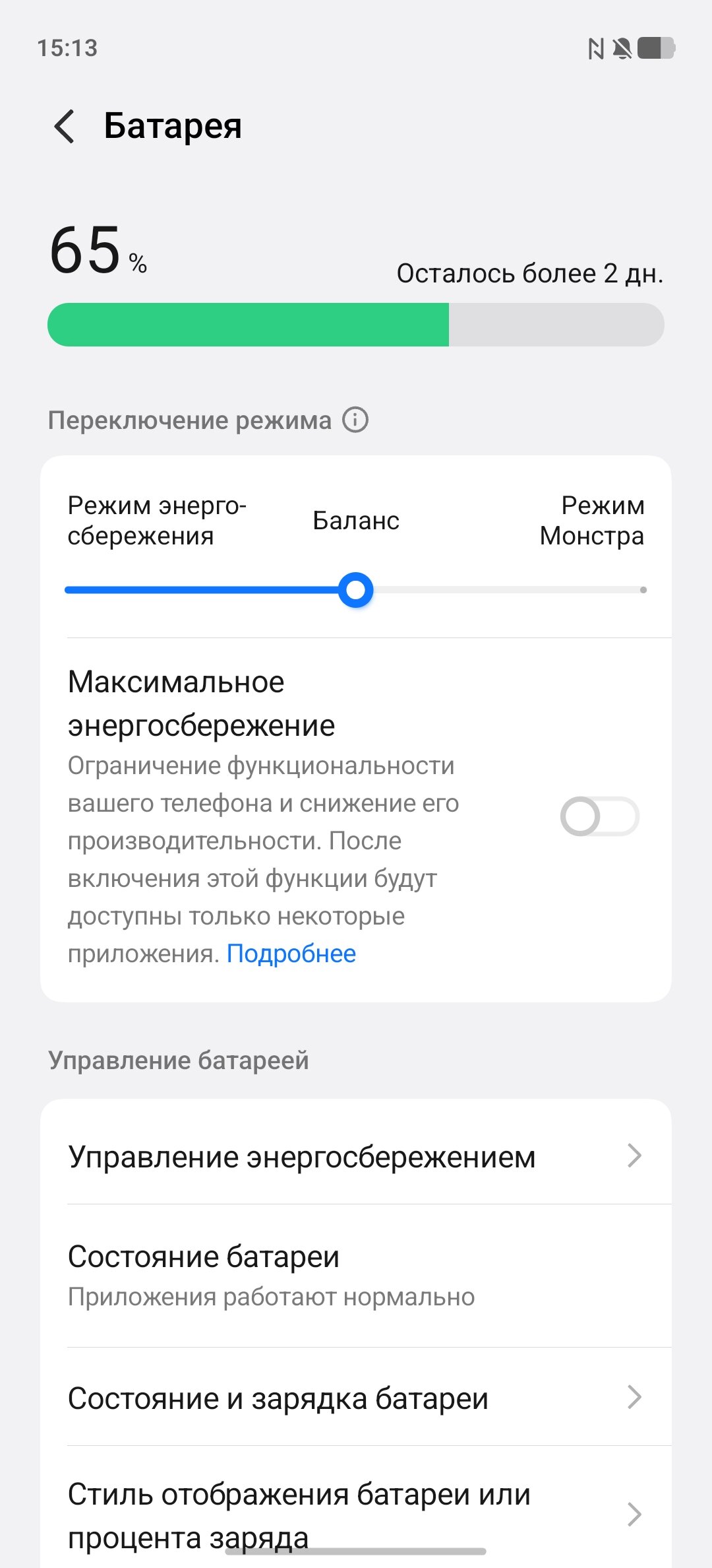 Зарядка осуществляется на мощности до 100 Вт. Для сравнения, iQOO 12 поддерживал восполнение энергии при мощности до 120 Вт, но у него и ёмкость аккумулятора была меньше — как по мне, дополнительные 850 мА⋅ч более чем нивелируют эти 20 Вт. При такой мощности за полчаса смартфон заряжается примерно на 60%, а для полного восполнения энергии нужно около 55 минут. Приятно, что производитель реализовал опциональный режим обходной зарядки, когда электричество минует аккумулятор и подаётся сразу на системные компоненты — это нужно для предотвращения деградации аккумулятора, когда смартфон на зарядке нагружается тяжёлыми играми и прочими ресурсоёмкими задачами.