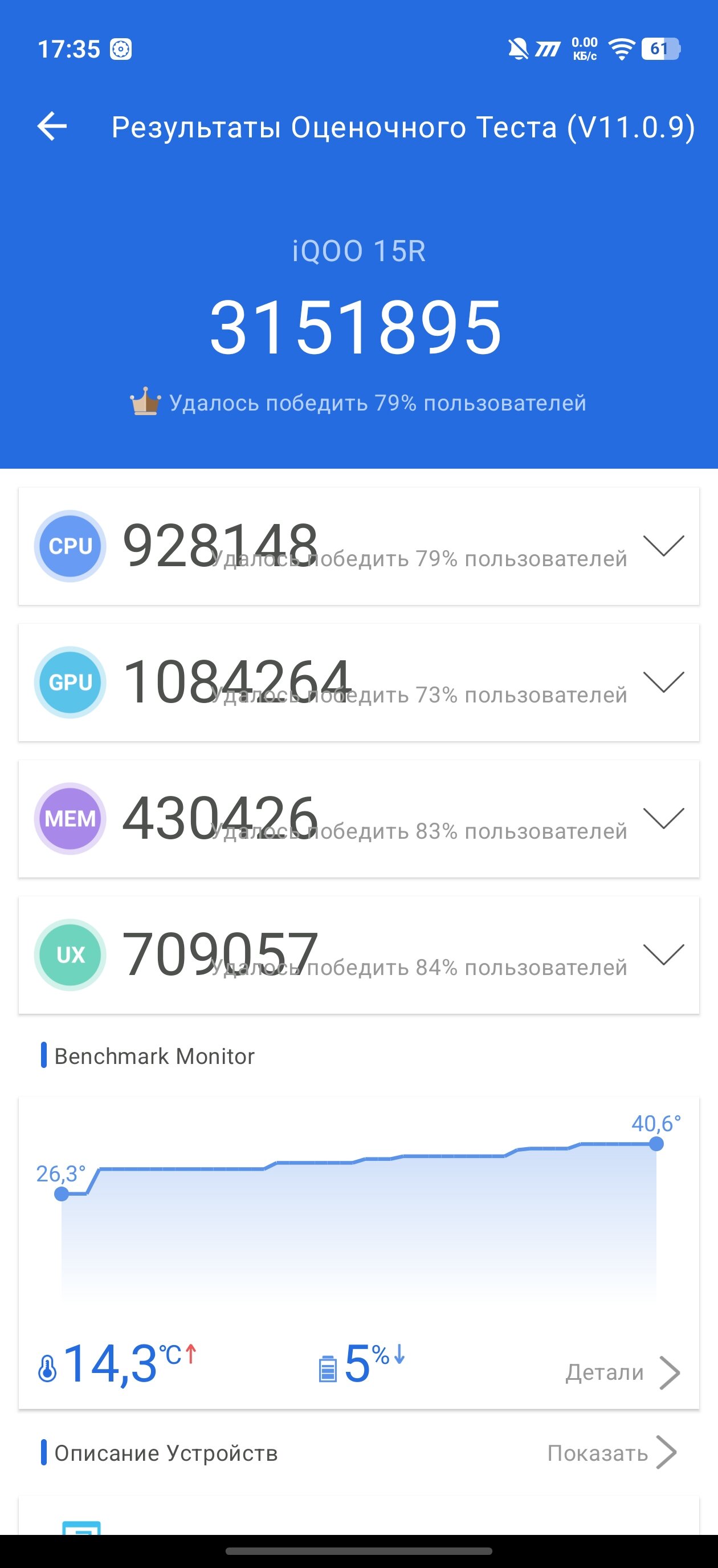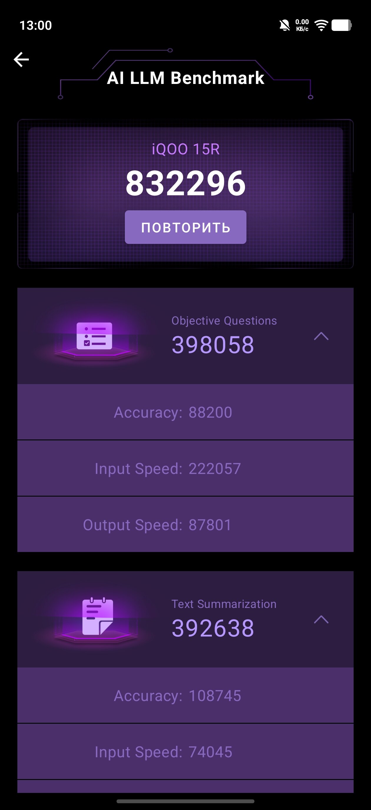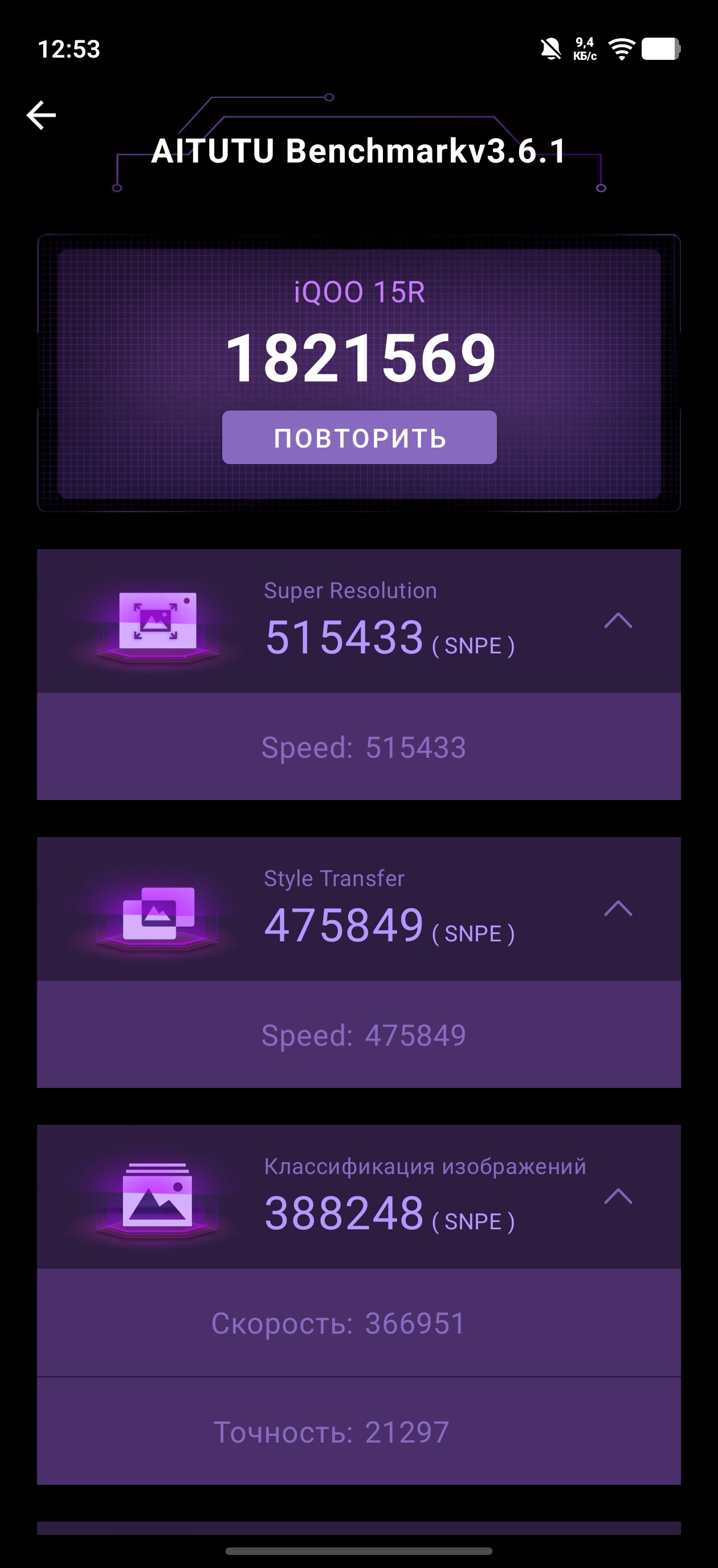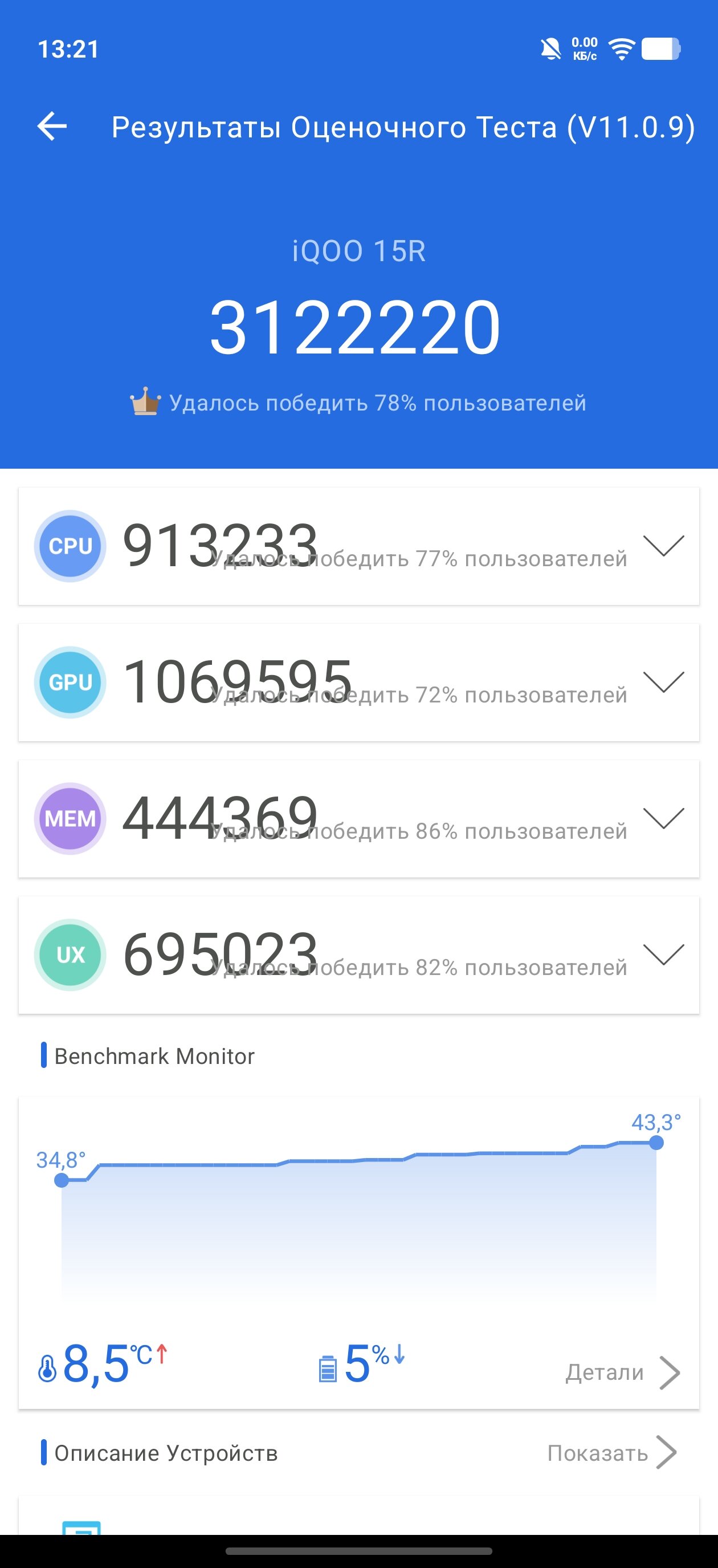 Как бы там ни было, давайте посмотрим на результаты бенчмарков. В iQOO 15R есть отдельный «режим монстра», так что синтетические тесты я прогнал дважды — с ним и без него. Результаты, я думаю, не потребуют дополнительных пояснений: смартфон демонстрирует крайне высокие оценки, одни из лучших, если не лучшие, в своём ценовом сегменте.
