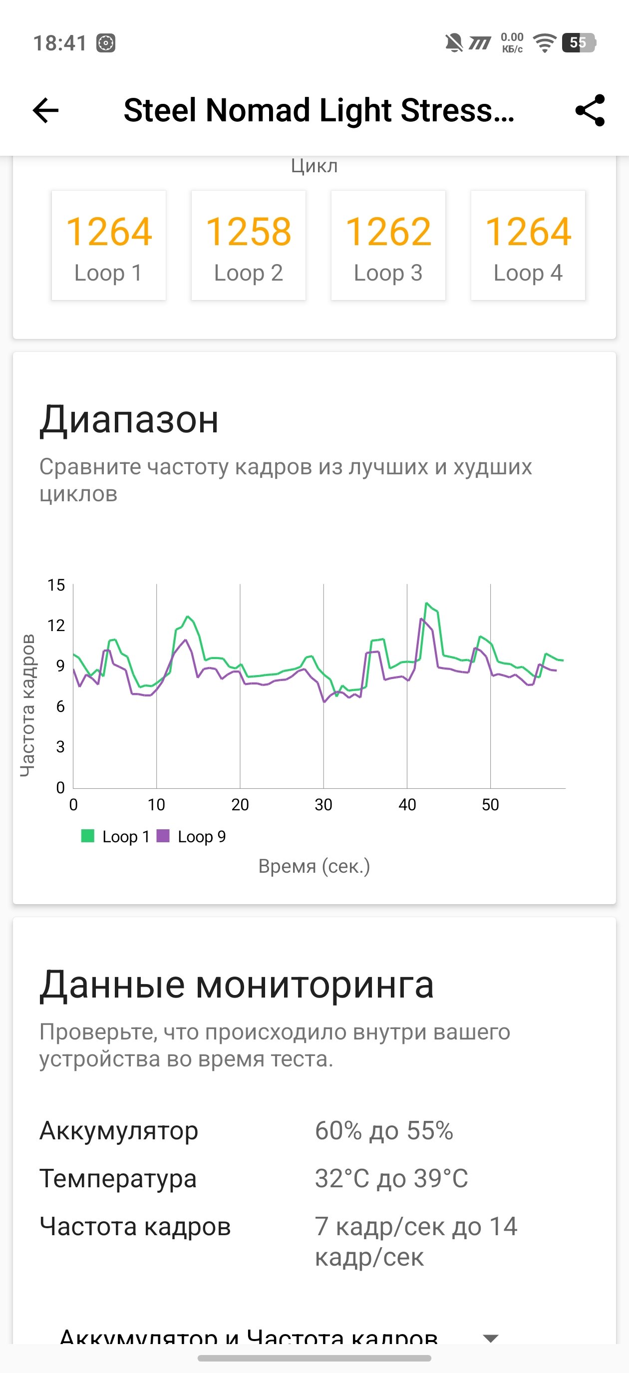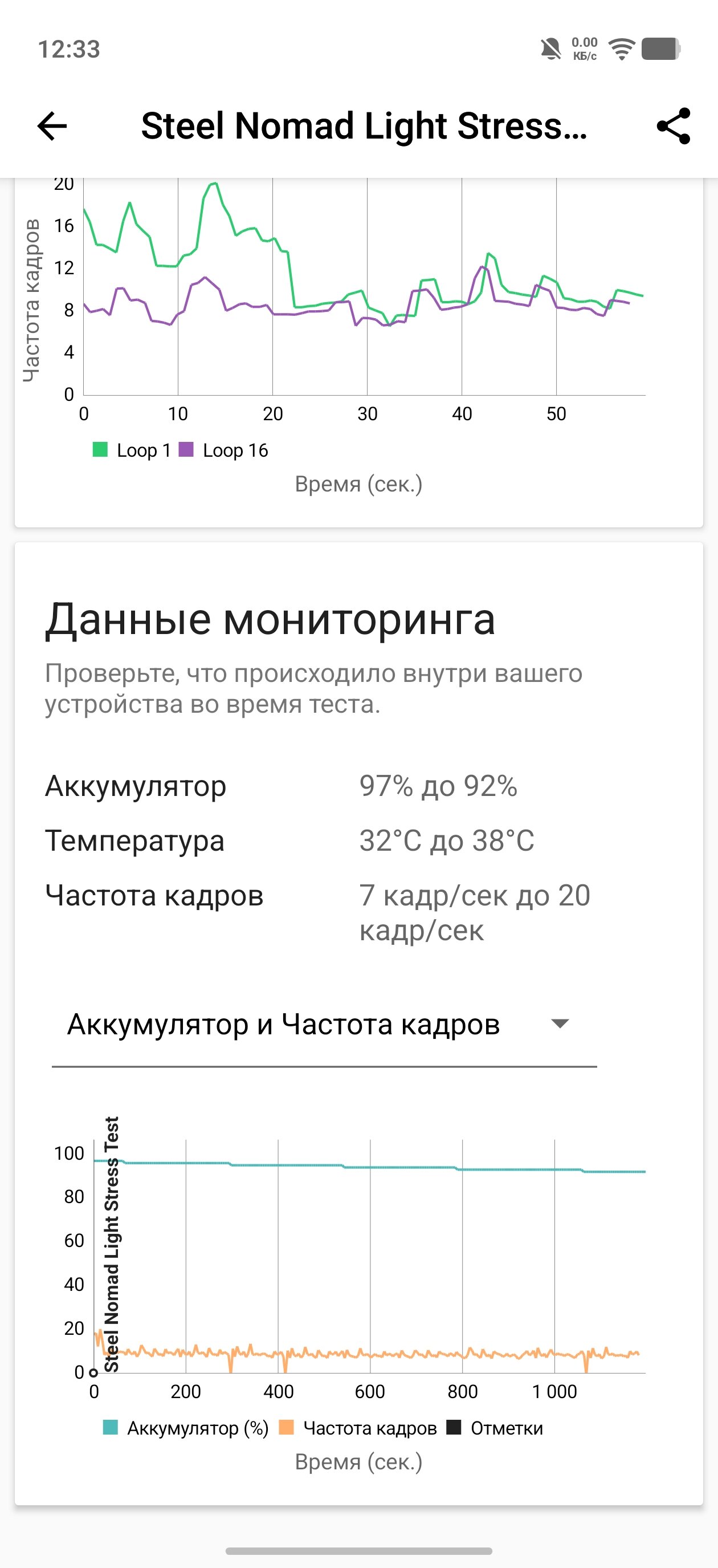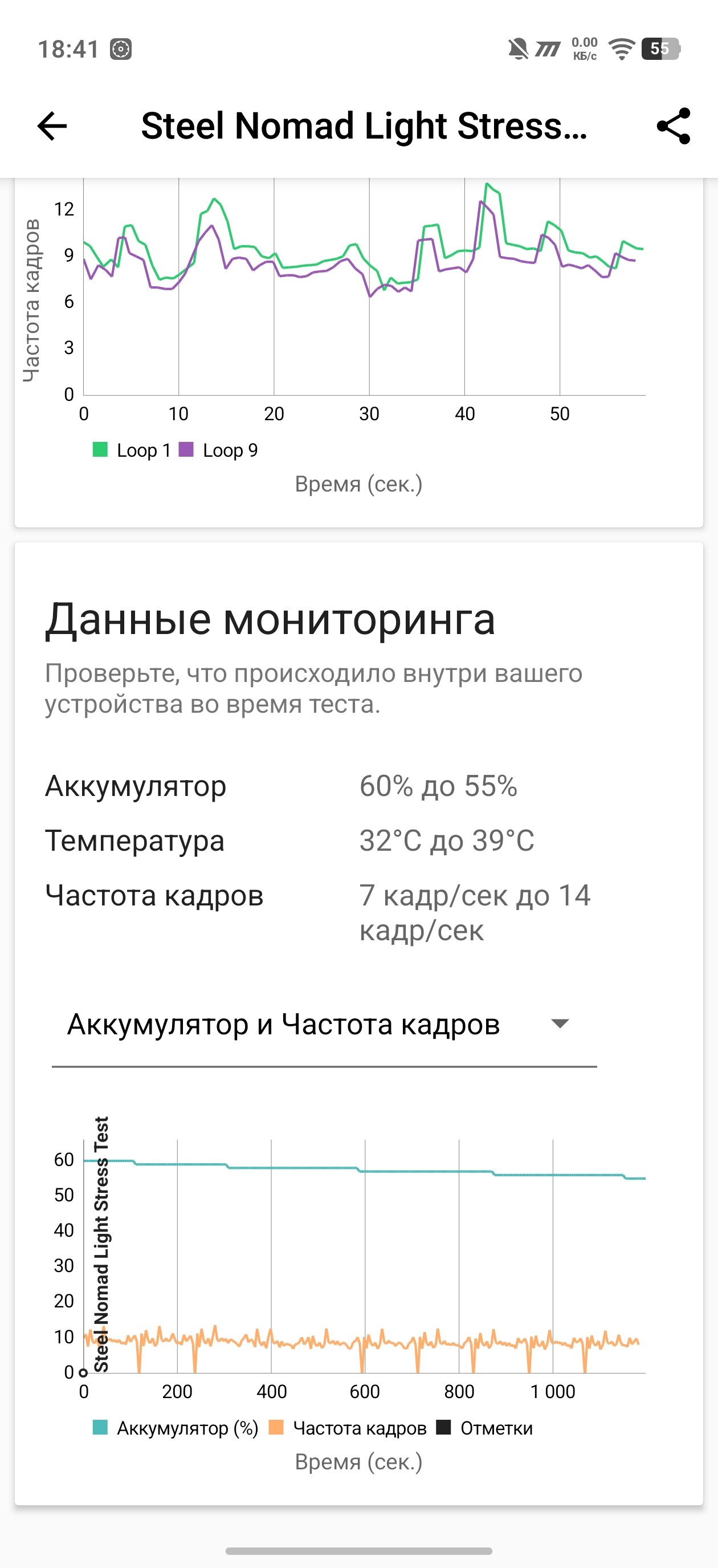 Стресс-тест Steel Nomad Light продемонстрировал возросшую устойчивую производительность в 91,5% (вместо 74%). Сами же испытания на троттлинг выдали хороший результат — падение частоты небольшое (по меркам настолько мощного чипсета), график довольно ровный, без резких скачков и падений. На практике это означает, что в тех же играх не будет нежданных просадок FPS в напряжённых экшн-сценах. К слову о гейминге.