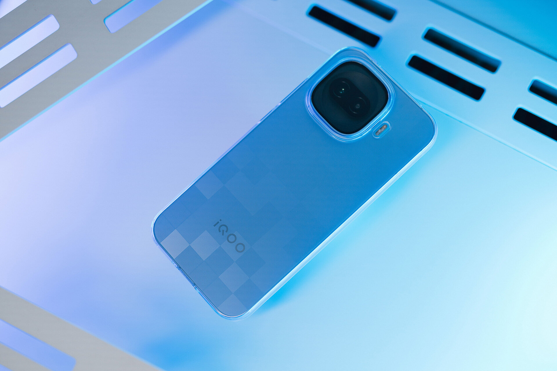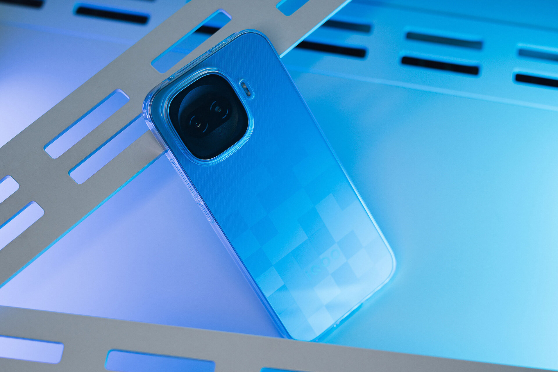 Мне iQOO 15R достался в расцветке «Цифровой серый» с шахматным паттерном (есть ещё монотонная «Альфа-чёрный»), состоящим из квадратиков разного оттенка — смотрится интересно, но это, конечно, дело вкуса. Её задняя панель покрыта стеклом, а рамка металлическая (аэрокосмический алюминий), причём матовая — как по мне, это оптимальный вариант, так как ободок и прочный, и ощущается премиально, и не собирает отпечатки пальцев.