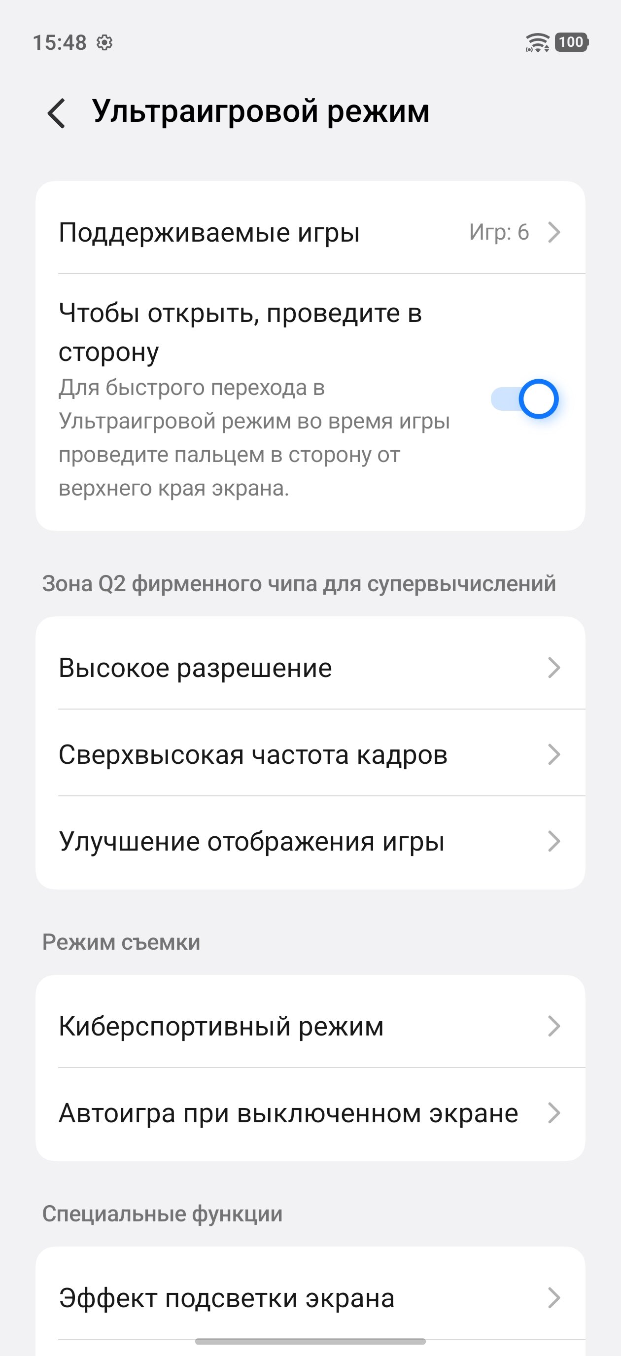 На самом деле, геймингу в iQOO 15R уделено очень много внимания, в настройках даже есть отдельный раздел «Ультраигровой режим». В нём, помимо вышеописанного, есть и другие примечательные функции, среди которых, к примеру, настройка приоритета частоты кадров, уведомлений во время игр, предотвращения случайных нажатий и подобного. Из совсем необычного — «супергироскоп», то есть возможность отрегулировать скорость отклика и стабилизацию гироскопа в совместимых играх. Есть регулировки и привычных элементов управления на экране, включая их чувствительность к нажатию или свайпы.