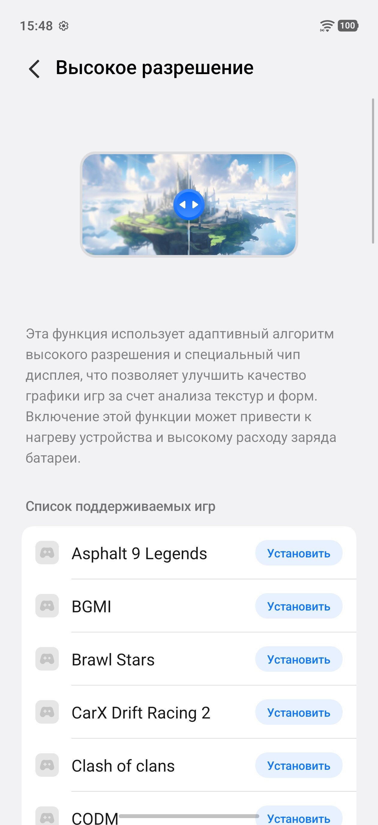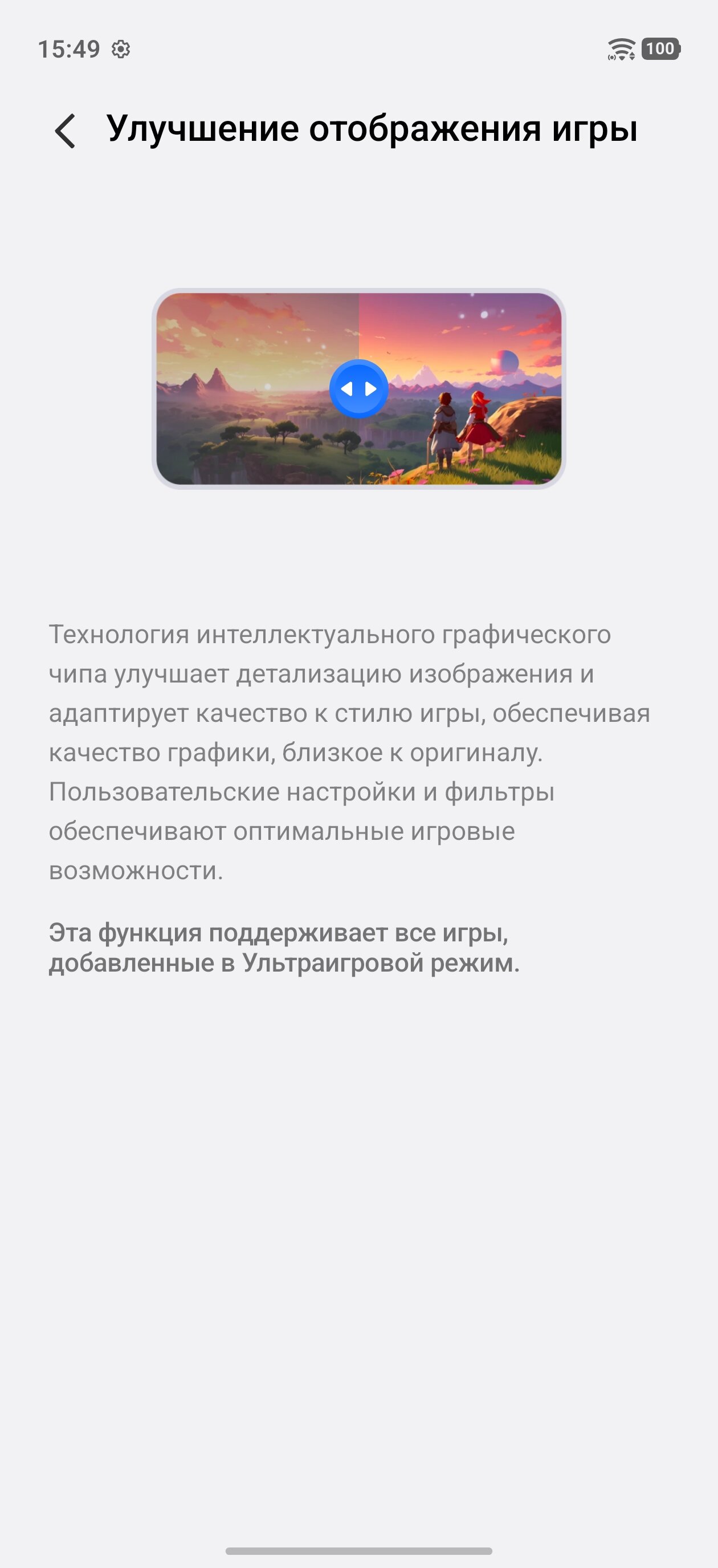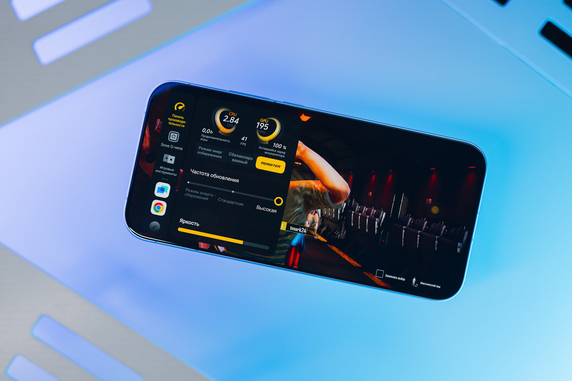 В связке со Snapdragon 8 Gen 5 используется фирменный игровой чип iQOO Q2. Он выполняет сразу несколько функций, так или иначе улучшающих восприятие игр. Одна из ключевых — апскейлинг текстур в поддерживаемых играх до нативного для экрана разрешения 1.5K, что делает облики персонажей, деревья, здания и прочие элементы более чёткими. Причём здесь используется не традиционное масштабирование, а продвинутые алгоритмы AIGC, оптимизирующие в том числе освещение и глубину объектов. Стоит лишь быть готовым к тому, что эта функция повышает температуру чипсета и увеличивает расход заряда — магии не существует, и более чёткая картинка + алгоритмы по её обеспечению расходуют ресурсы.