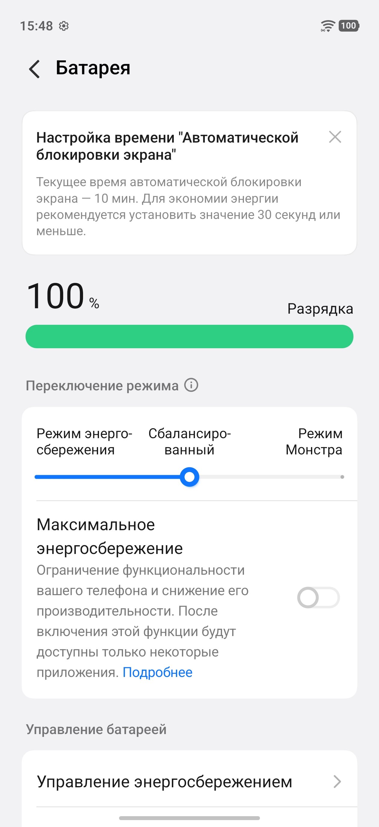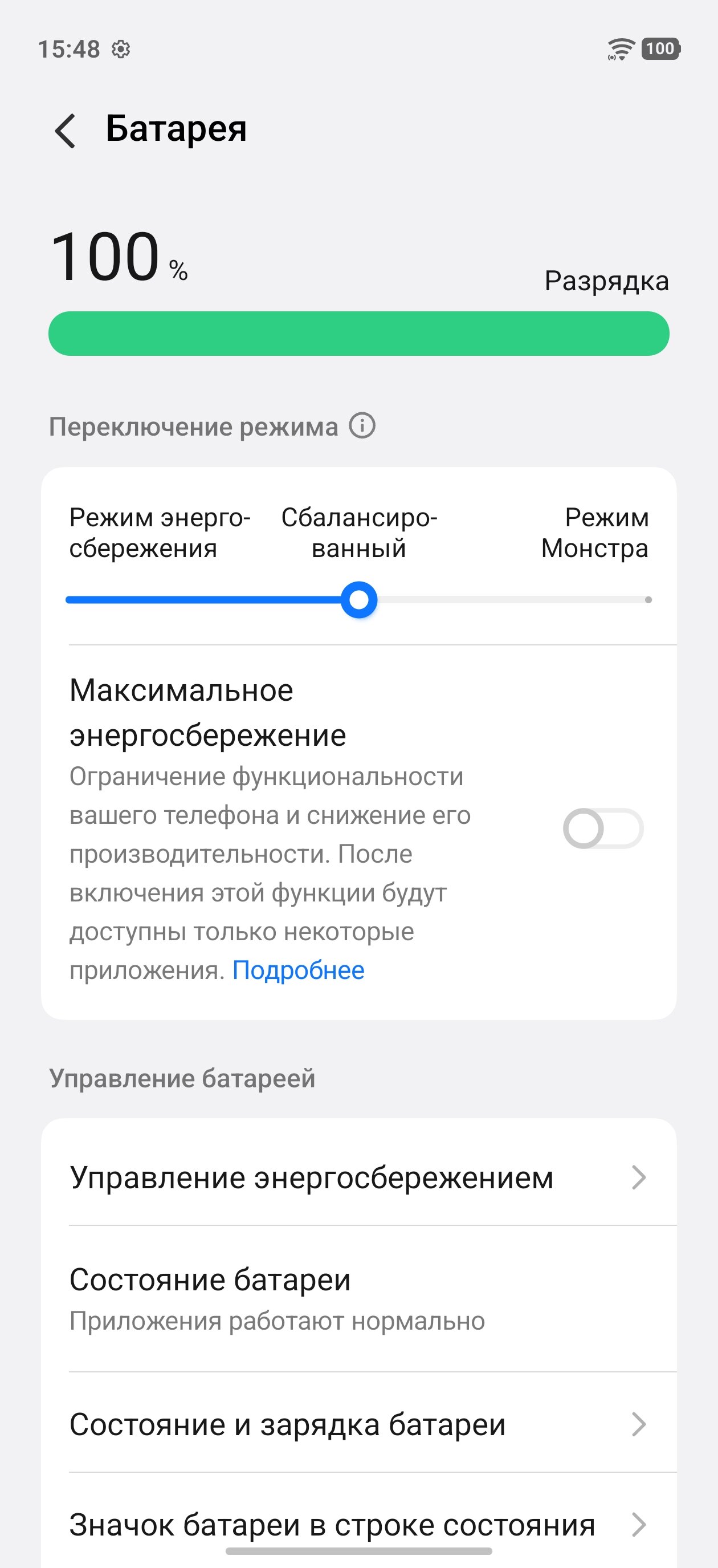 iQOO обеспечила 15R поддержкой и «проходной» зарядки — энергия может миновать аккумулятор, попадая сразу на материнскую плату. Такая технология крайне полезна для сохранения срока службы батареи, если в процессе подпитки смартфон нагружается тяжёлыми играми или программами (девайс не заряжается, но и не разряжается, а аккумулятор при этом остаётся холодным). К слову о сроке службы: производитель заявляет о сохранении высокой ёмкости в течение трёх лет. Обычно это означает, что накопительный элемент сохранит не менее 80% своего объёма к окончанию заявленного срока. Если это справедливо, то, по моим математическим подсчётам, в случае с iQOO 15R объём аккумулятора через 36 месяцев будет не менее 6080 мА⋅ч. А это больше, чем у некоторых смартфонов изначально.
