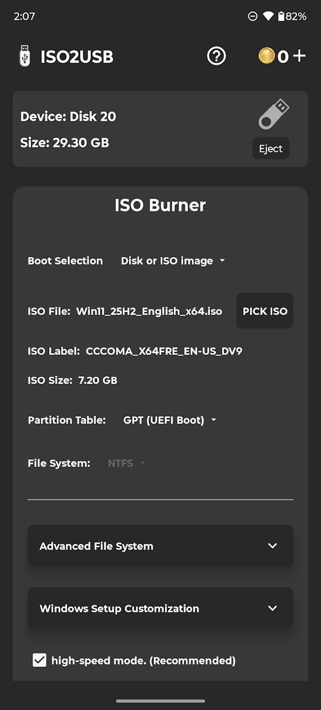 Приложение работает с системой монет для определенных задач. Запись ISO-образа Windows стоит 2 монеты, а FreeDOS или не загрузочные форматы — 1 монету. Однако запись ISO-образов Linux, Raspberry Pi OS и DMG-образов macOS совершенно бесплатна. Вы можете заработать монеты, просматривая рекламу с вознаграждением, или приобрести их напрямую.