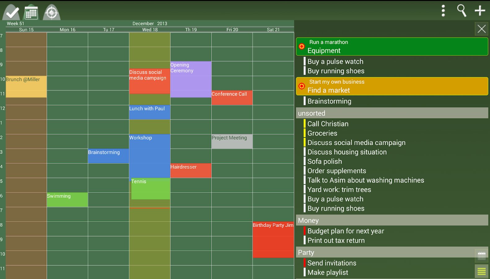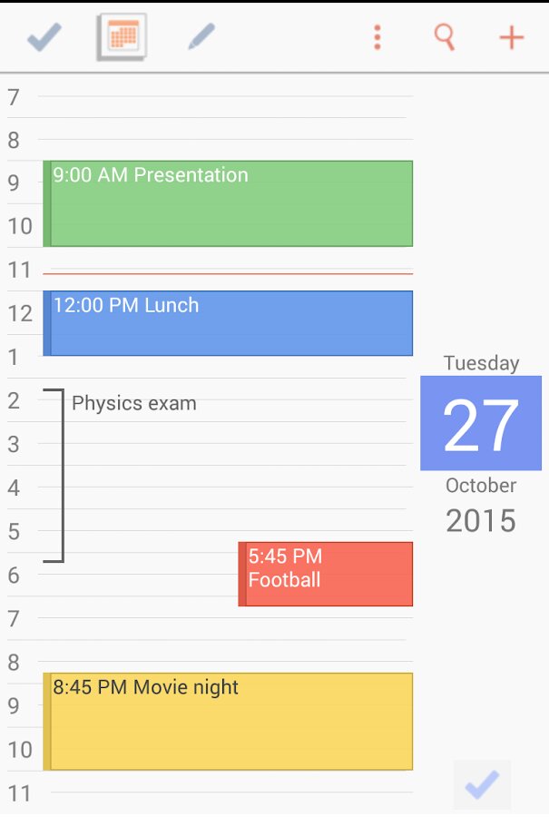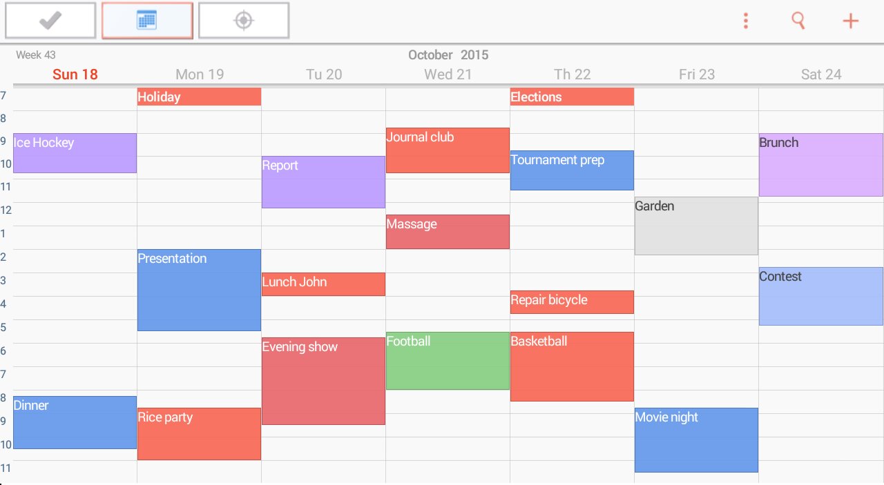 - Полностью прокручиваемый календарь с просмотром дня, недели или месяца
