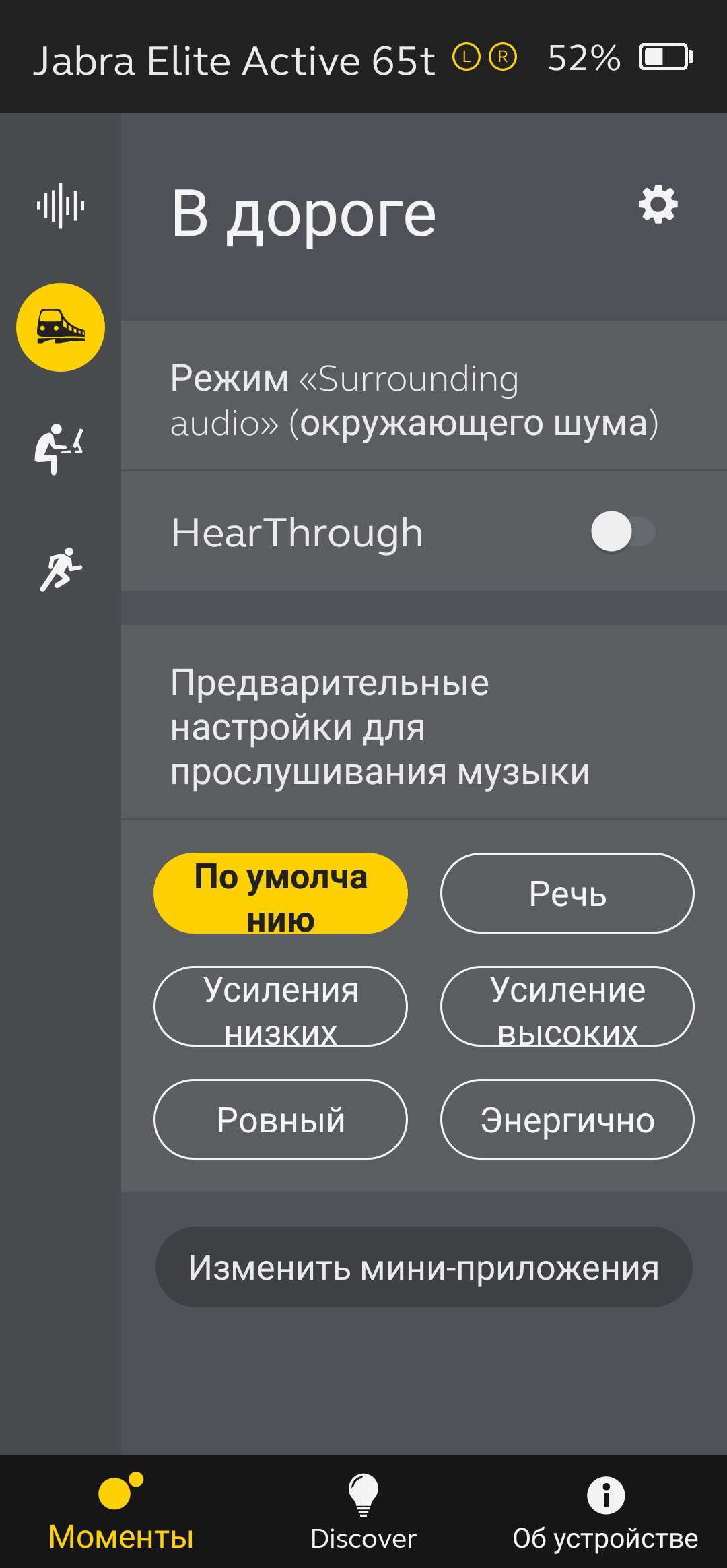 Третий раздел «В дороге» позволяет активировать/отключить режим HearThrough и эквалайзер.