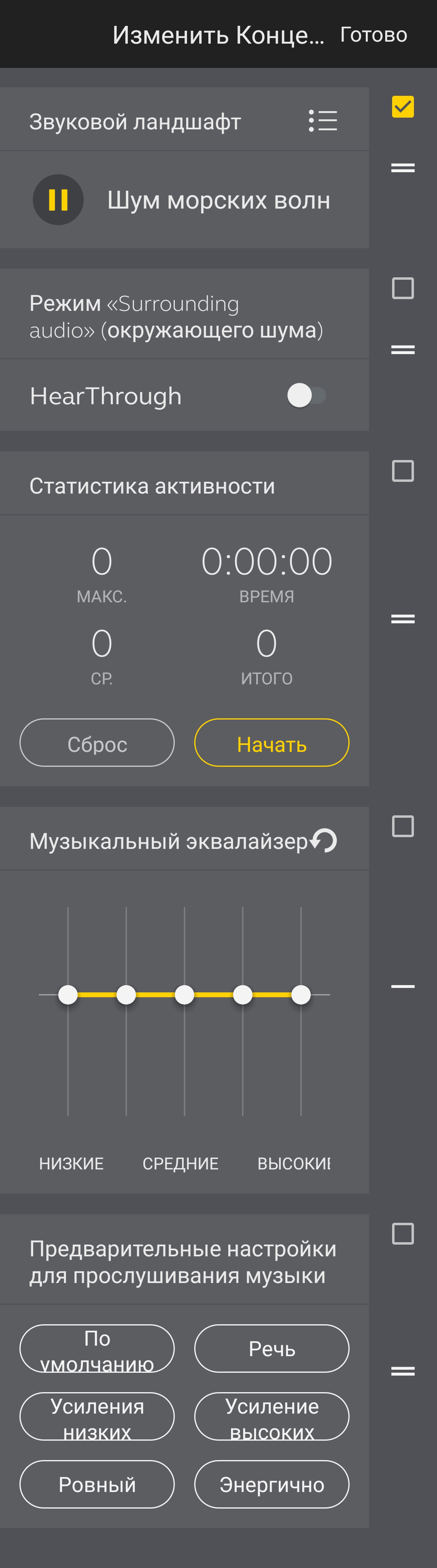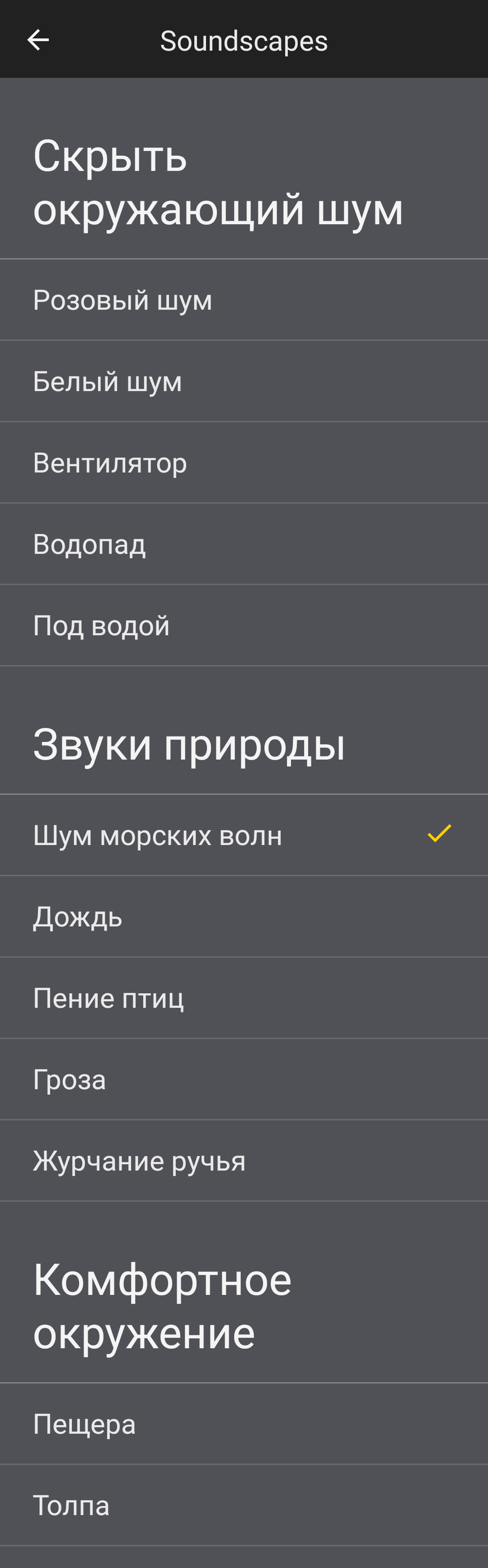 Раздел «Концентрация» предназначен для работы в офисе или сна. Подразумевает под собой абстрагирование от внешних звуков и активацию на заднем фоне подавляющего шума, например звуков водопада, работающего вентилятора, дождя, волн или грозы и др.