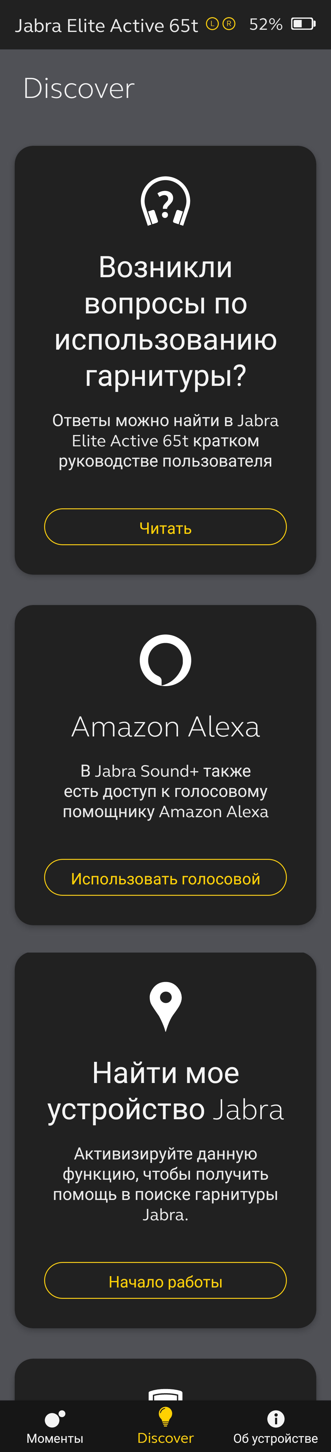 Вторая вкладка Dicover позволяет пользователю активировать виртуальный голосовой помощник: Amazon Alexa, Siri или Google Assistant. А так же включить GPS модуль для поиска гарнитуры Jabra, если вдруг она потерялась.