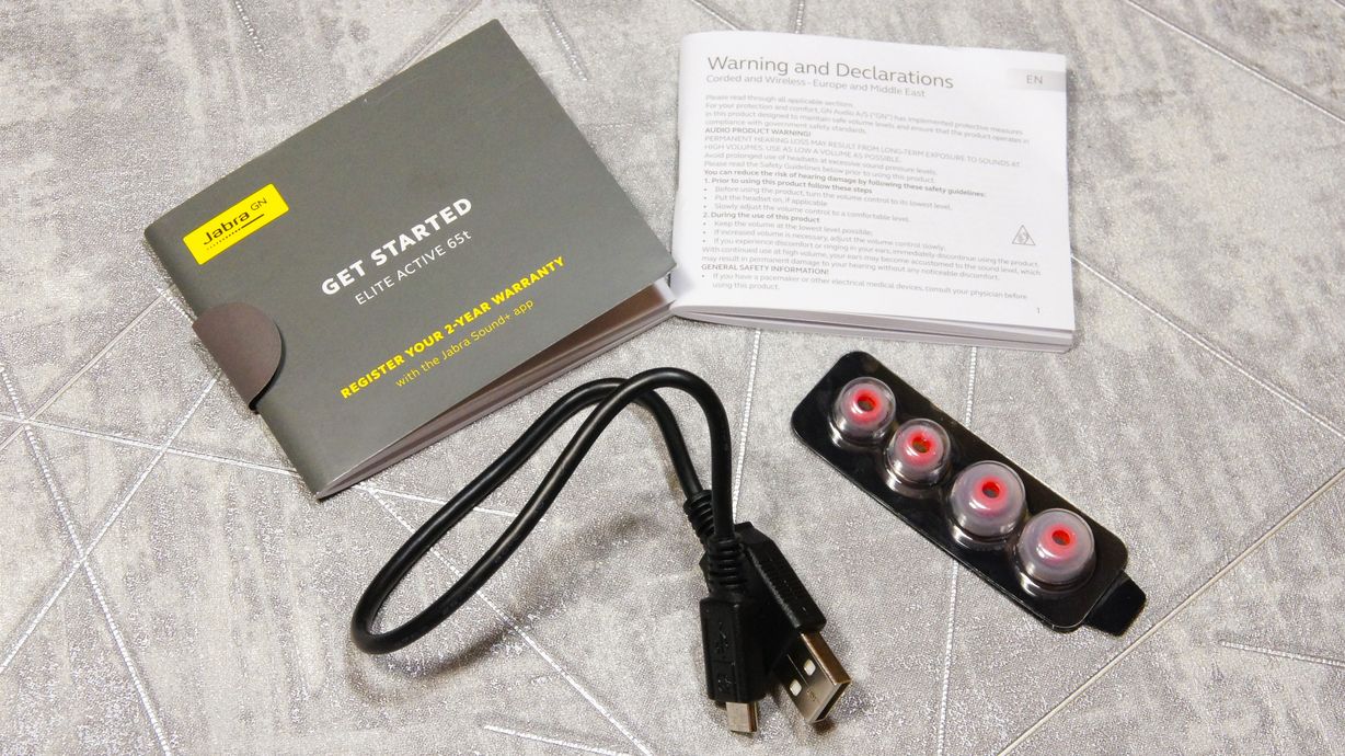 В комплекте к Jabra Elite Active 65t прилагаются: твердый пенал, который является также зарядкой, комплект гелиевых ушных амбушюр EarGels различного размера (маленькие, средние и большие), короткий провод для зарядки с разъемом micro-USB и бумажная документация.
