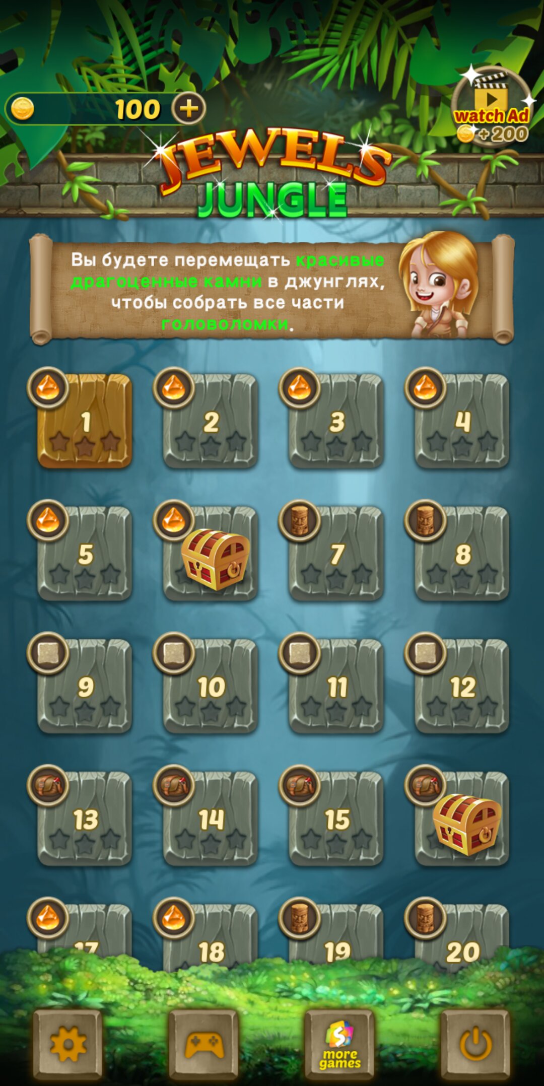 Jewels Jungle — увлекательная головоломка в жанре «три в ряд», погрузит вас в атмосферу джунглей, где когда-то давным-давно были затеряны сокровища. Вам предстоит увлекательное путешествие по находке всех сокровищ.